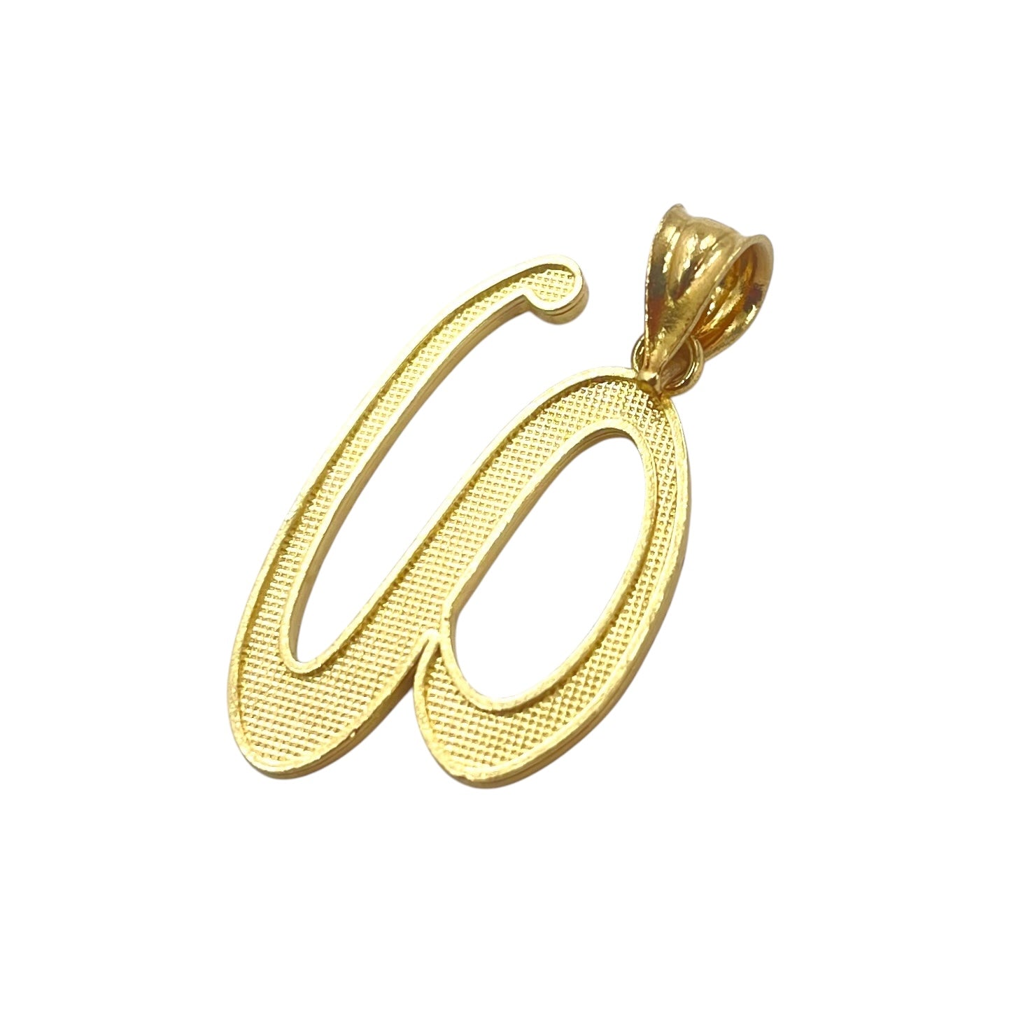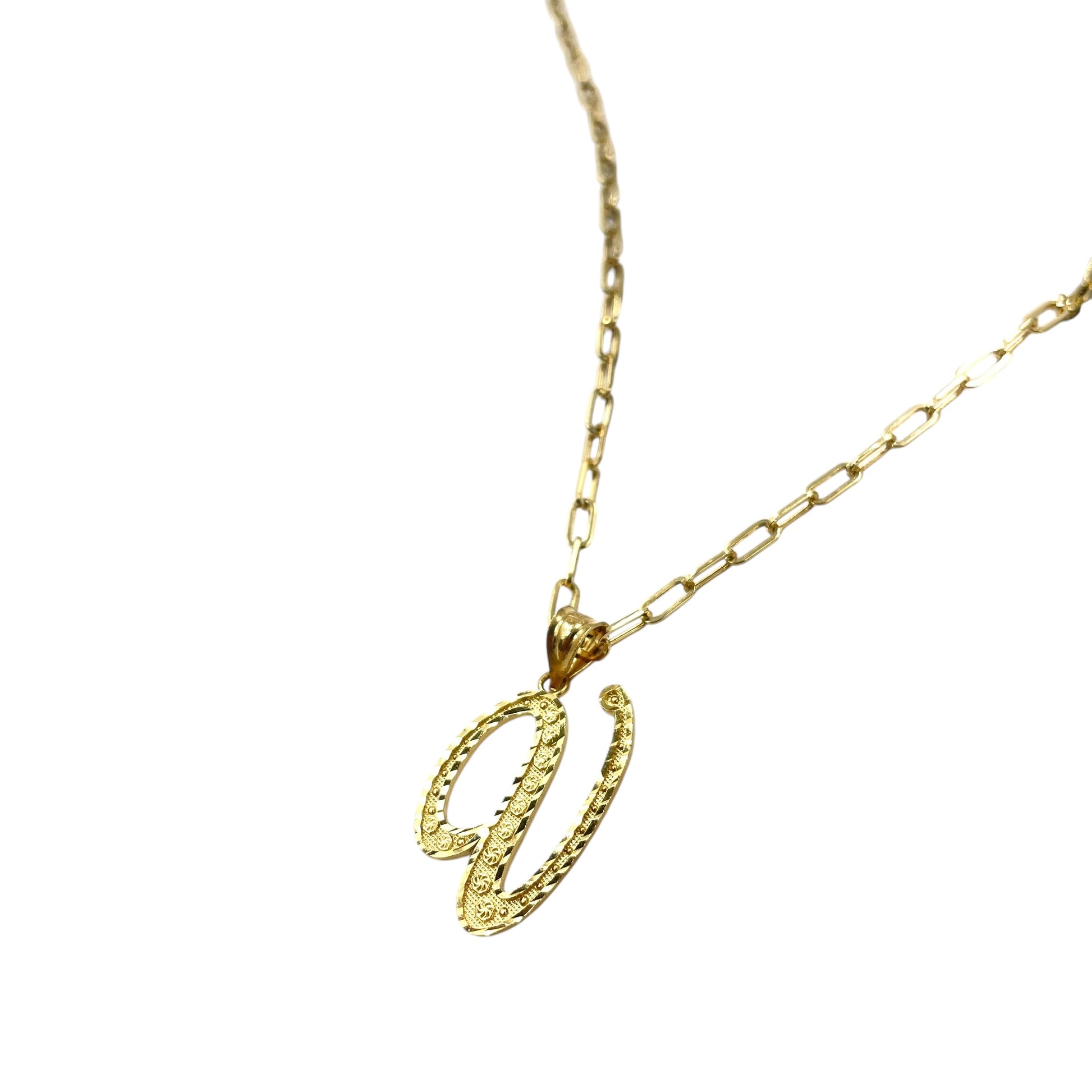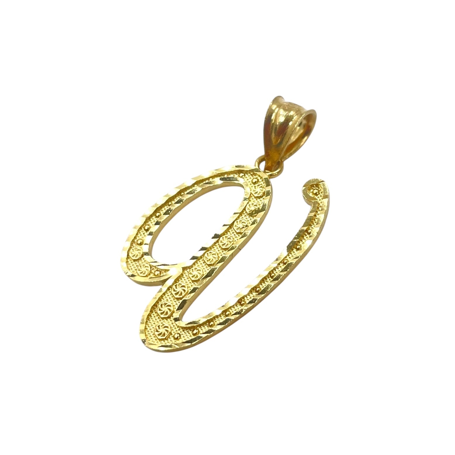 A textured initial "V" pendant in cursive and in 14K solid yellow gold.
