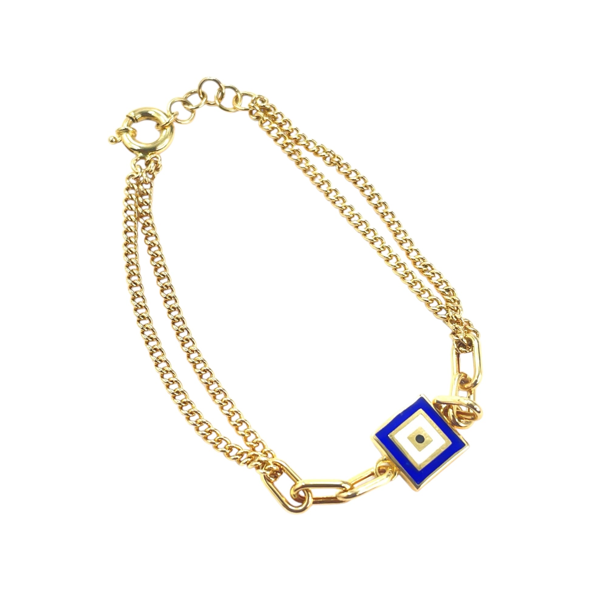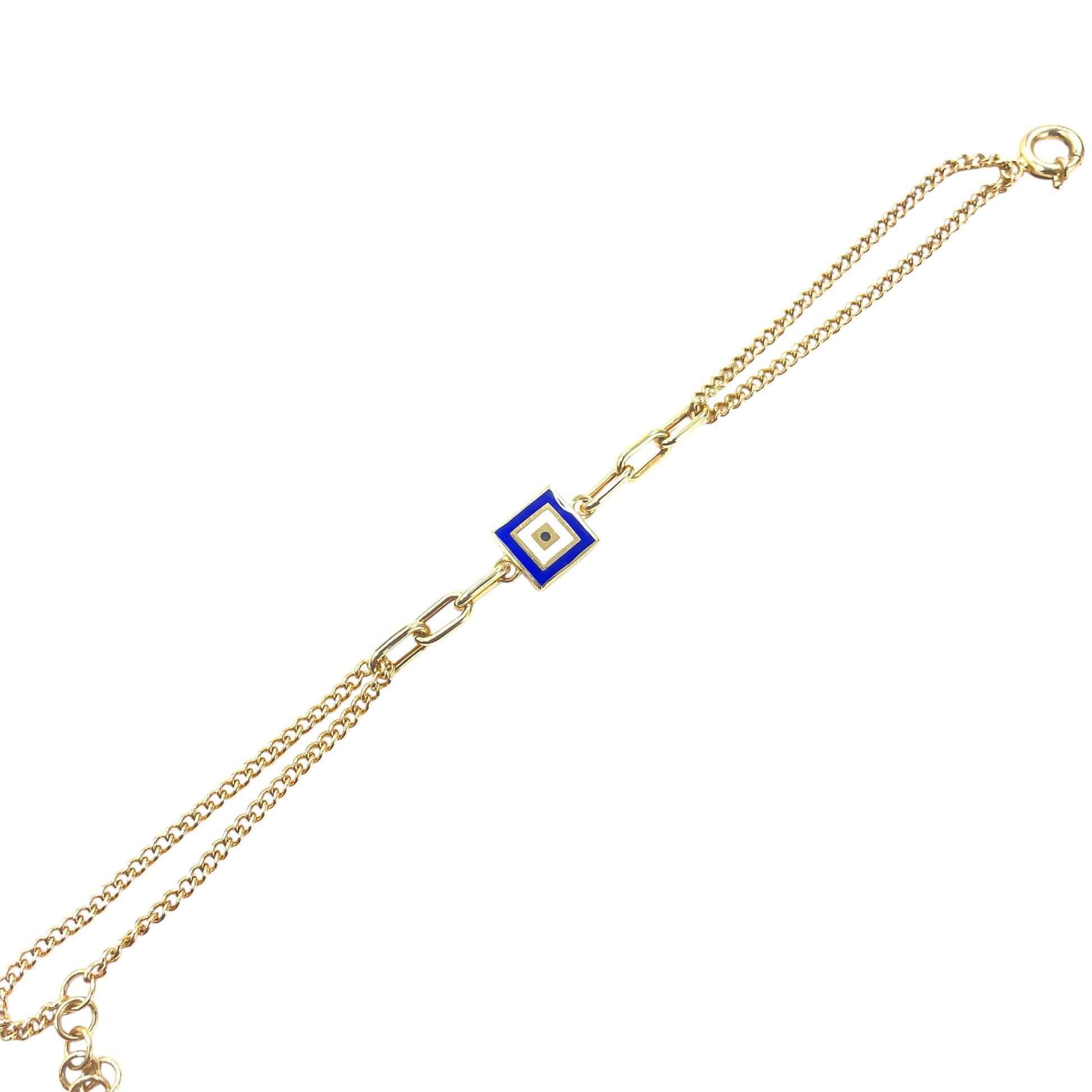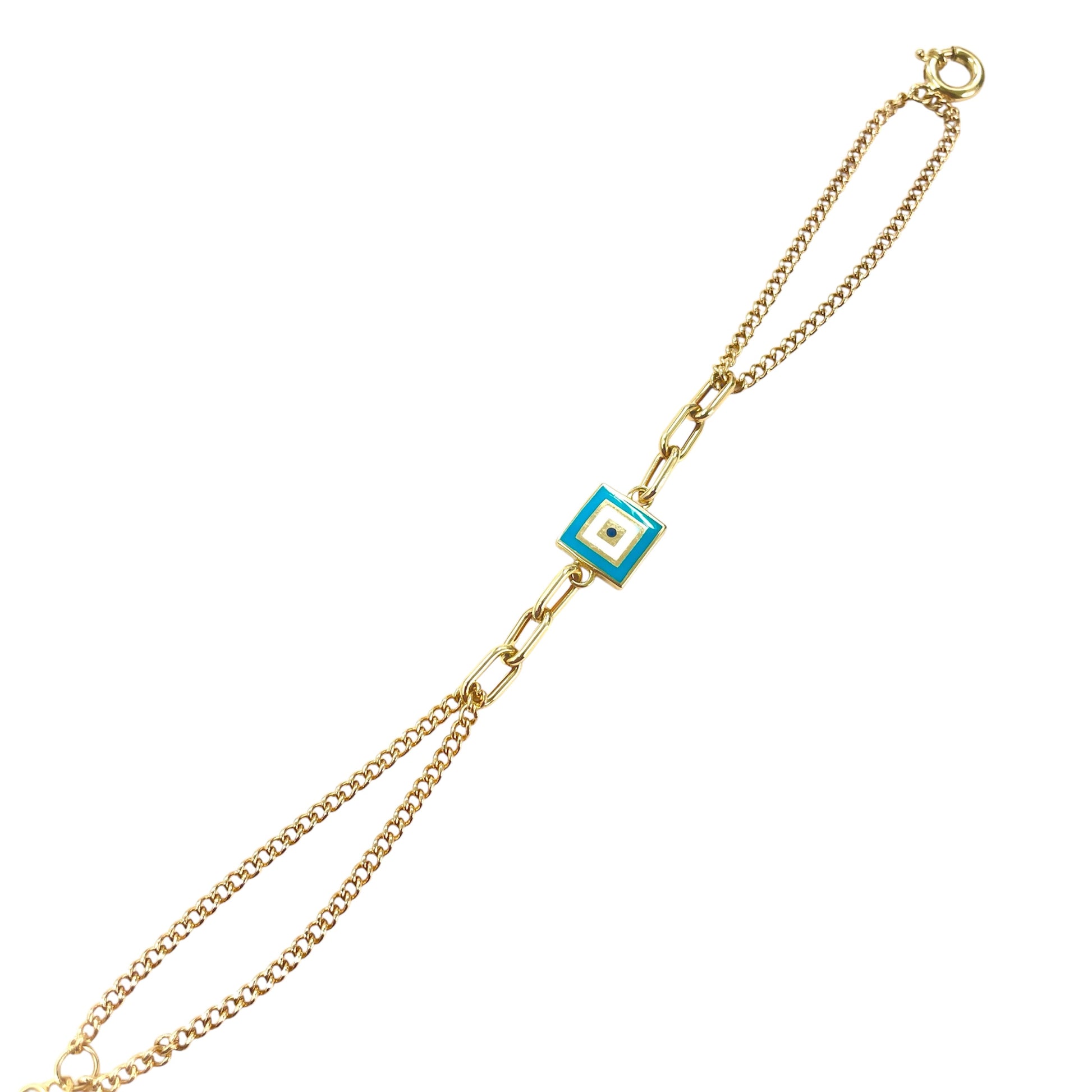 A 14k solid yellow gold double chain bracelet with 14k yellow gold paper clip chains with a reversible square evil eye charm in blue/teal.