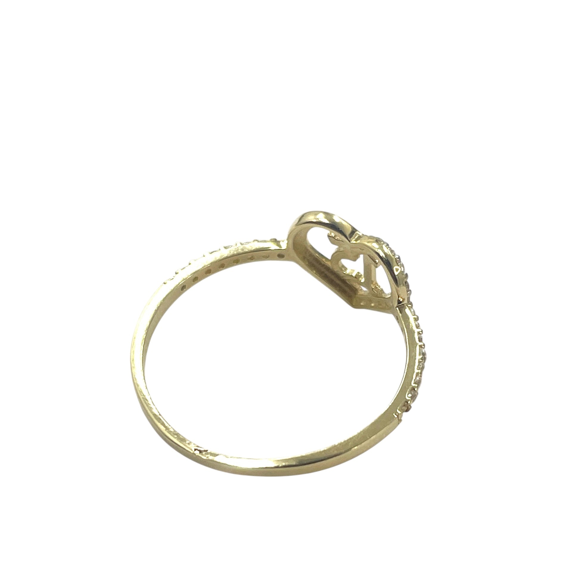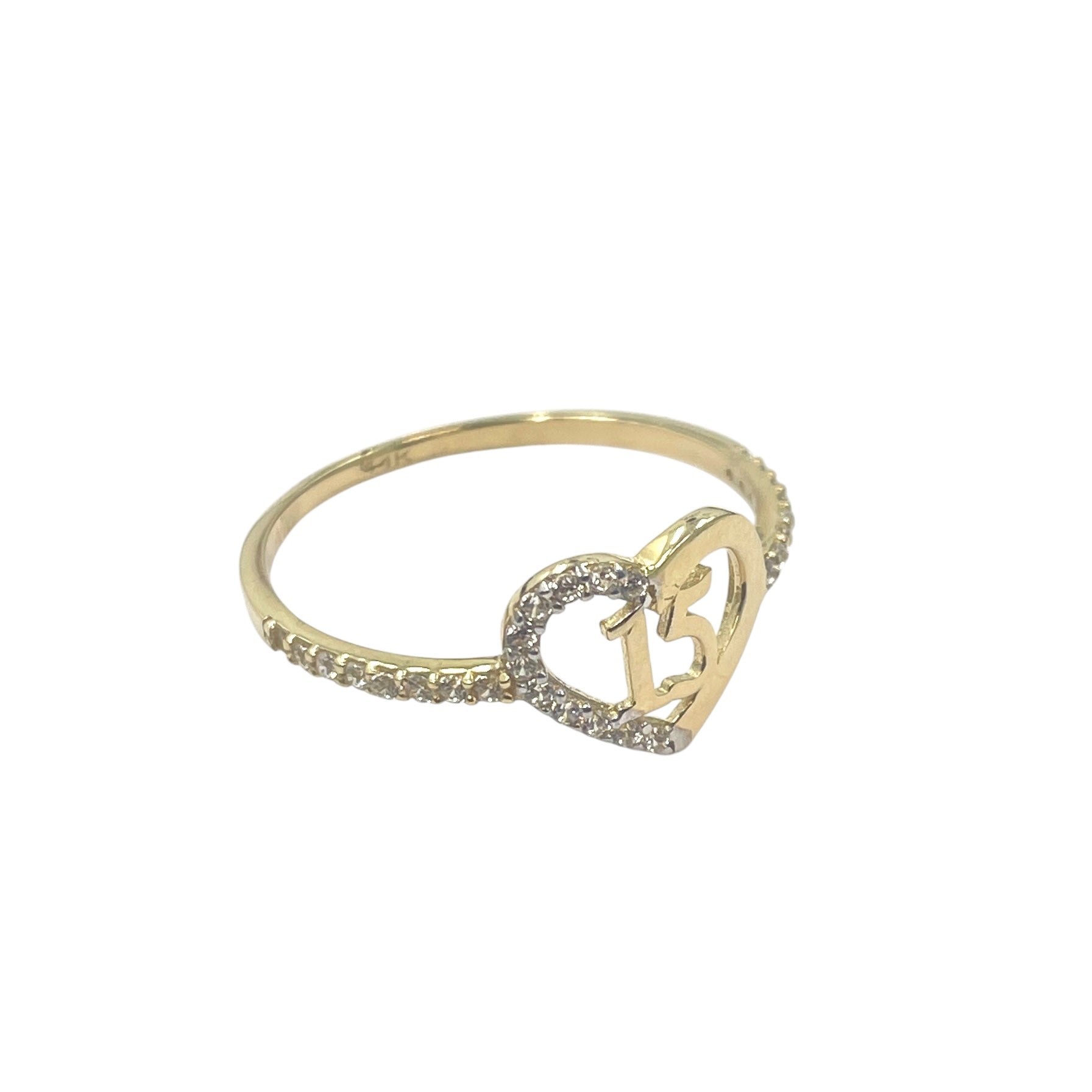 A thin, heart-shaped, quinceañera ring in 14k solid yellow gold and cubic zirconia