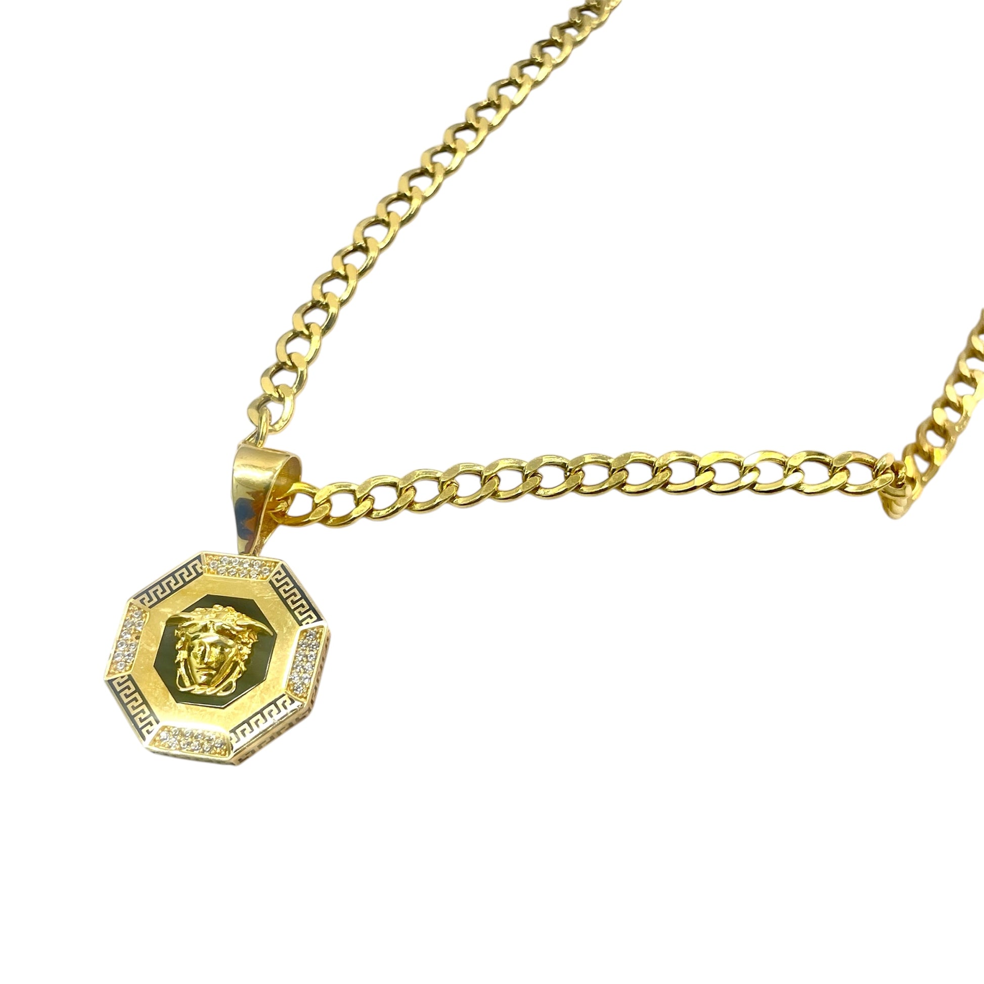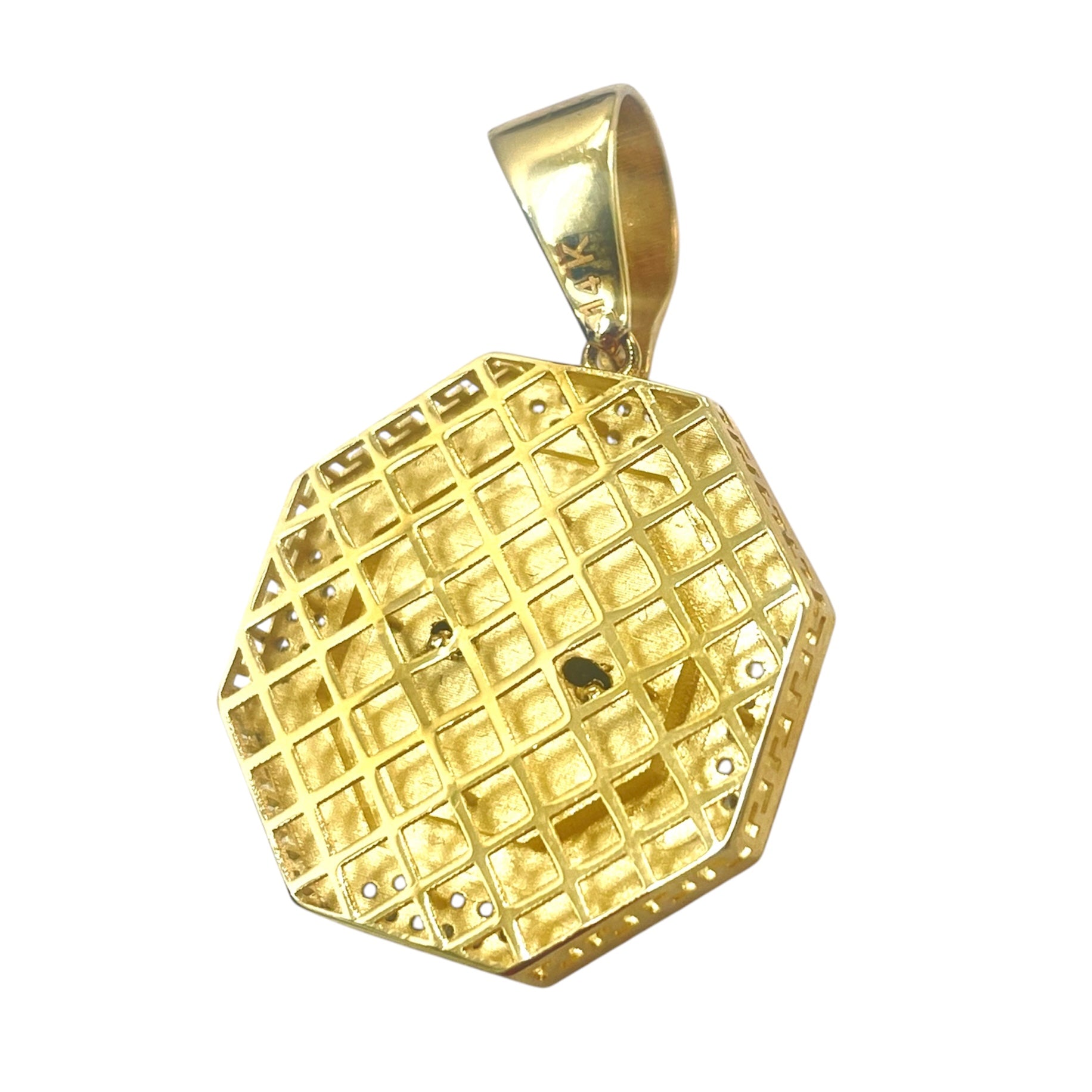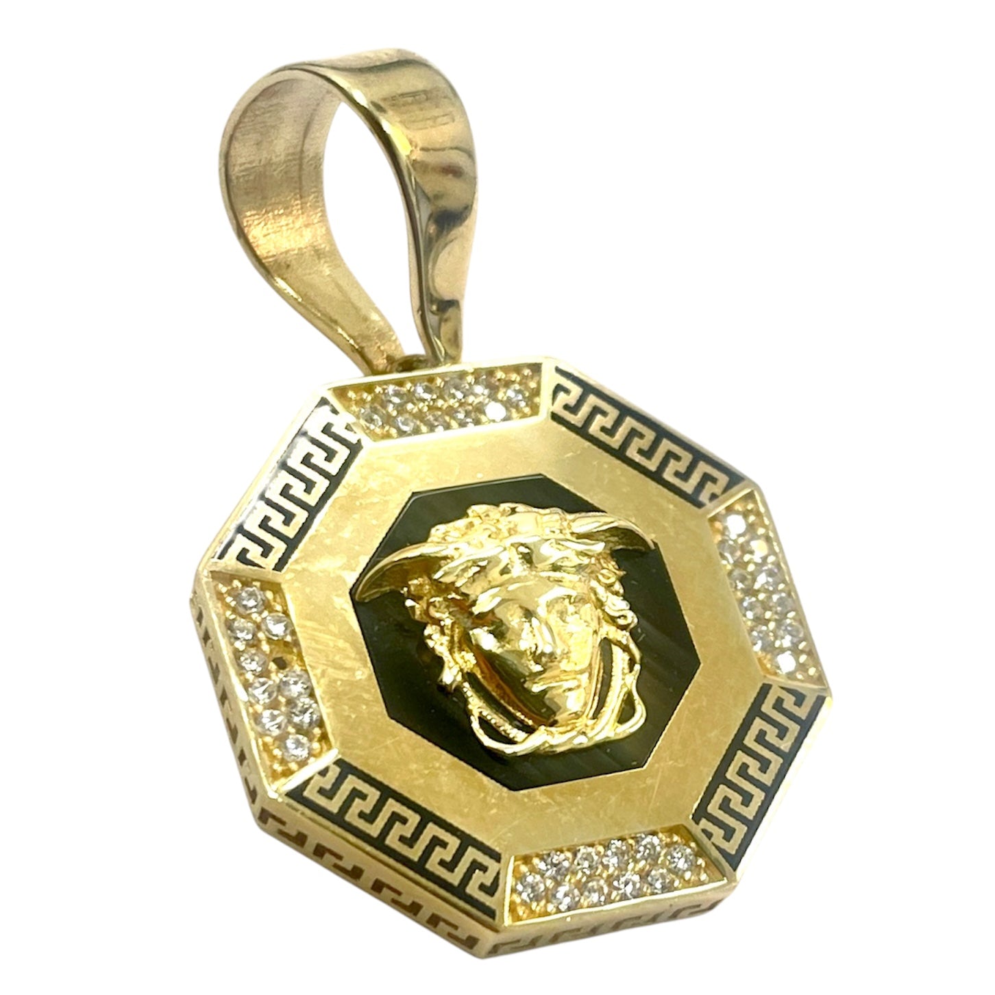 14k solid gold hexagon Medusa pendant in black/gold Greca pattern.