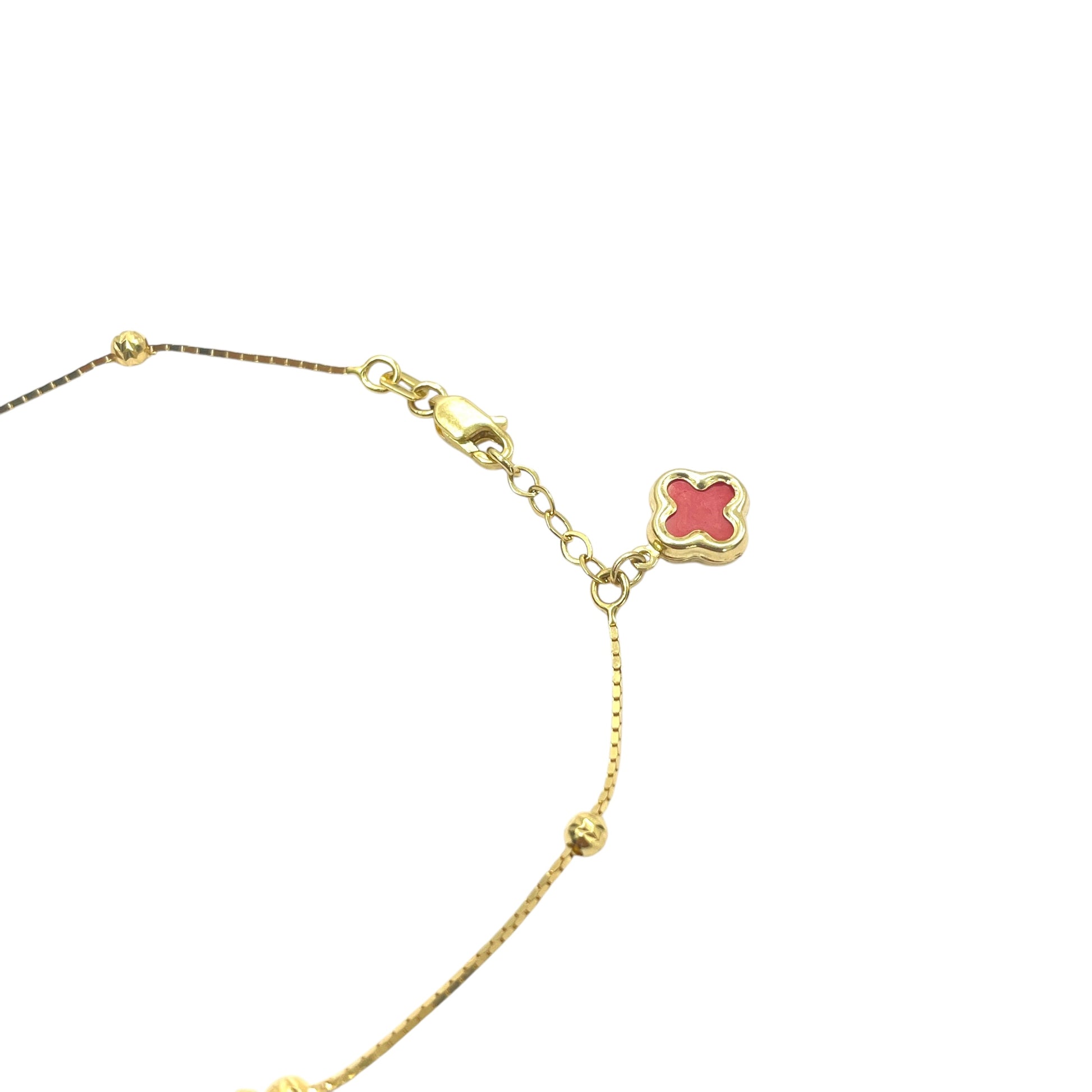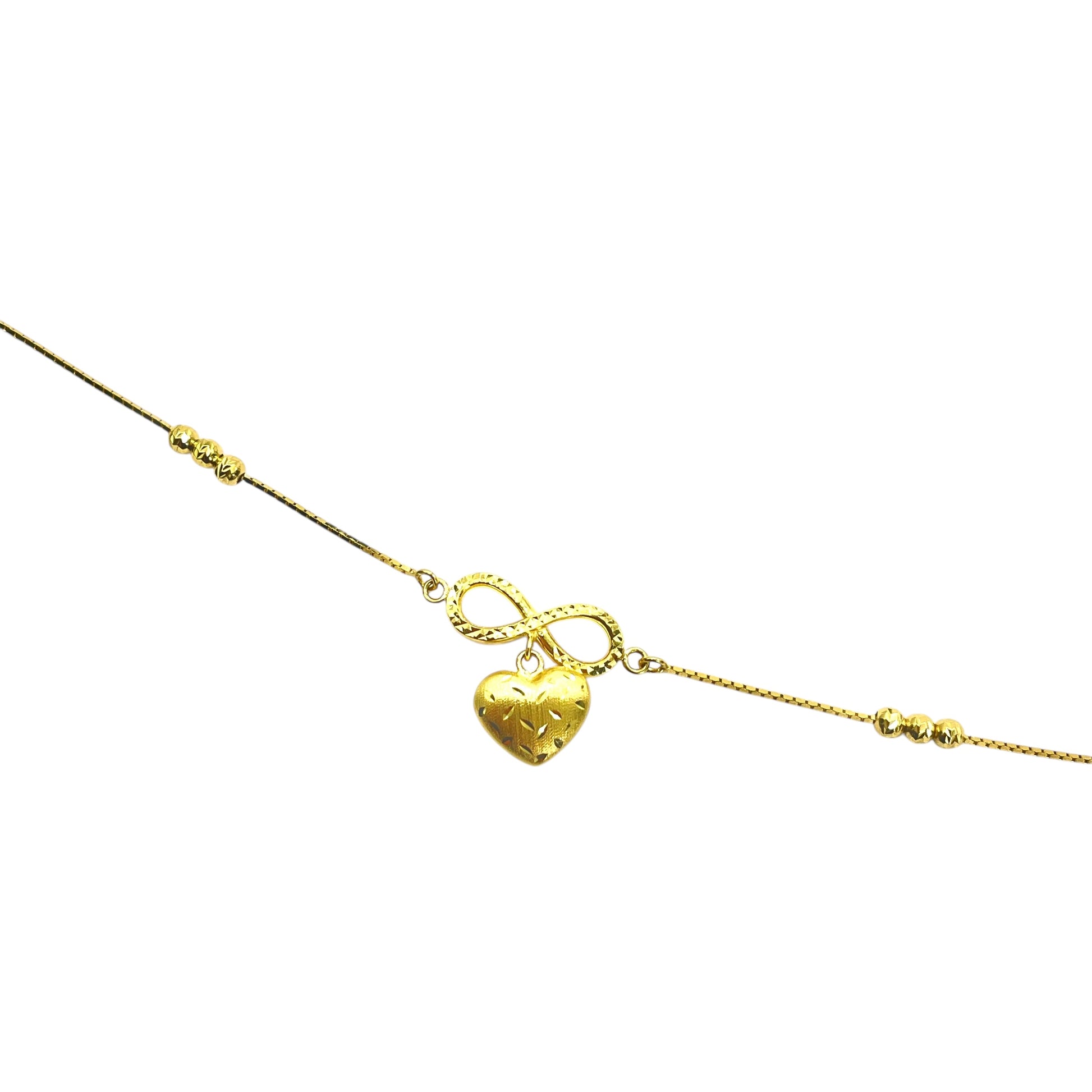 An infinity charm bracelet embellished with beads, a colored clover charm, and a heart. All in 14k solid yellow gold.