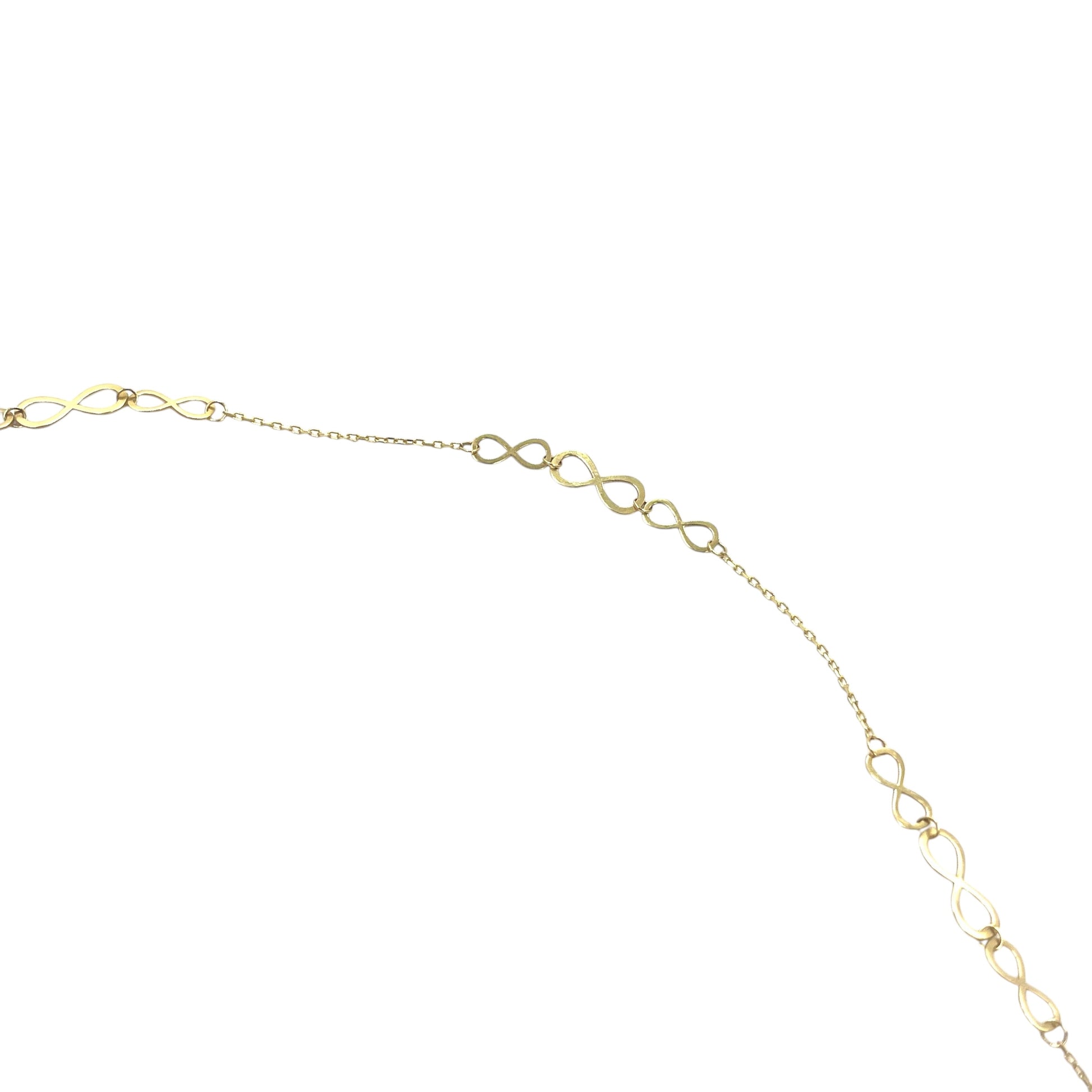 A fancy infinity link chain bracelet with a spring ring clasp. All in 14K solid yellow gold.