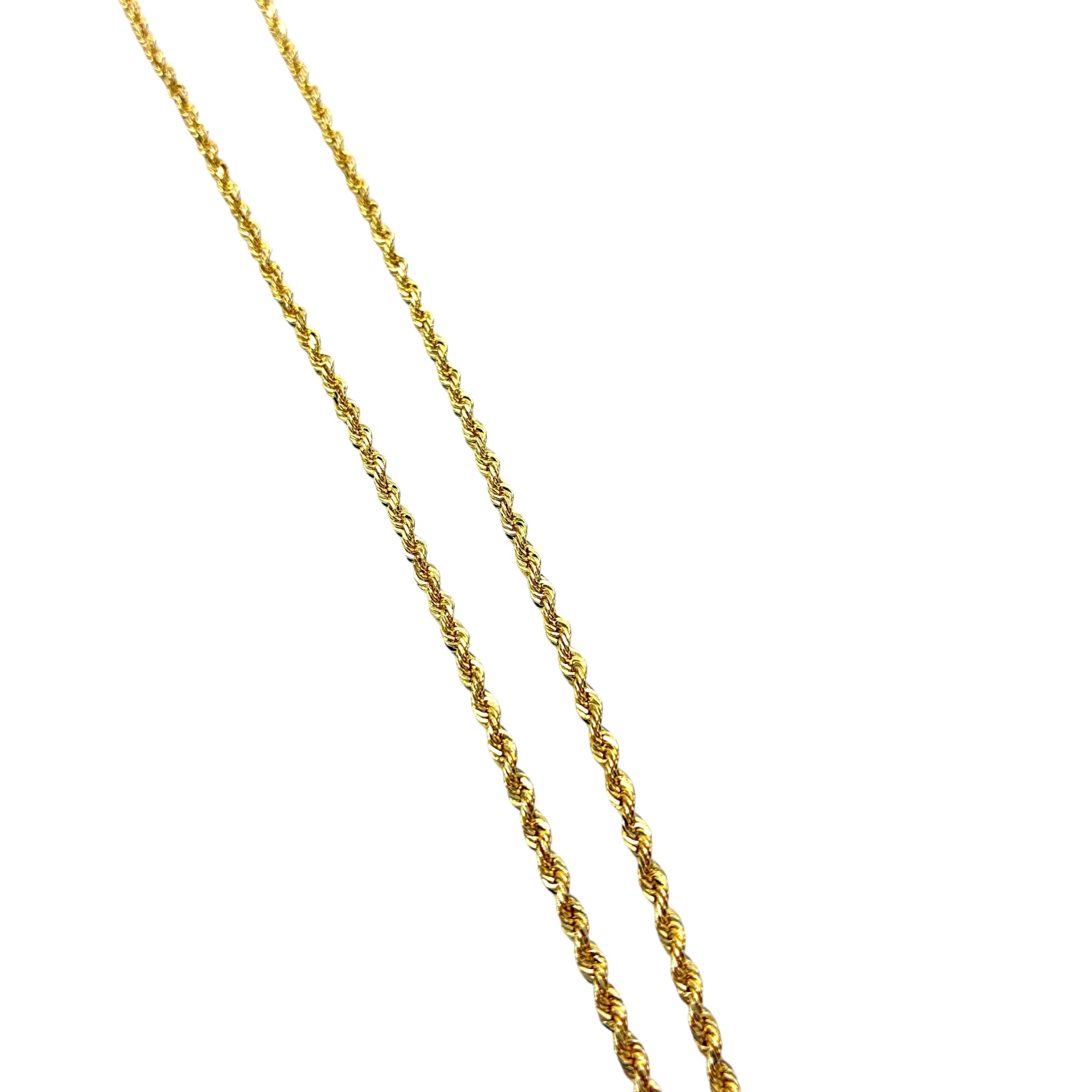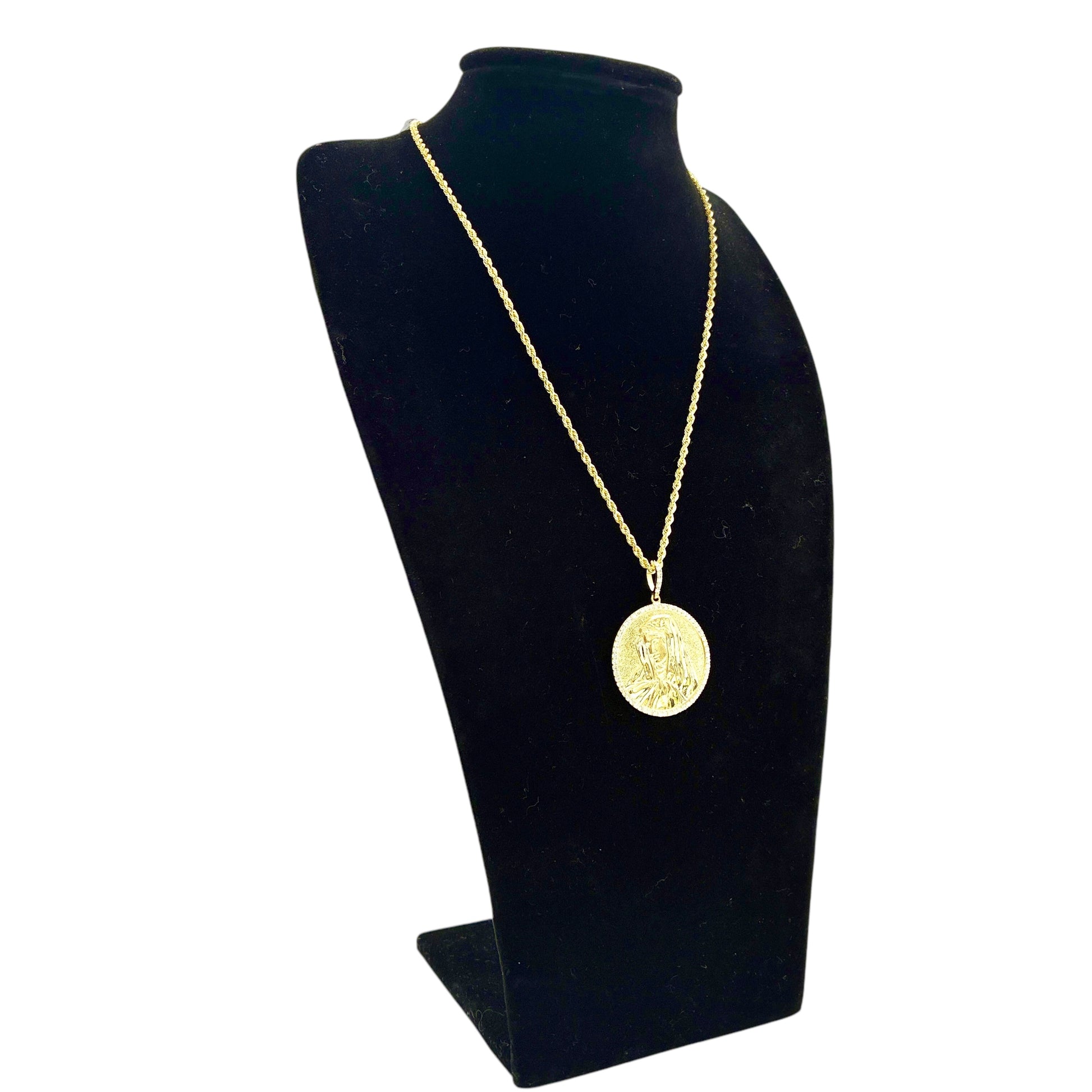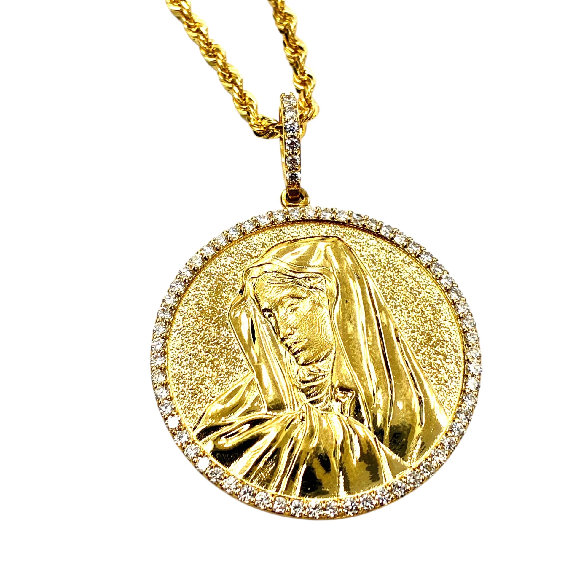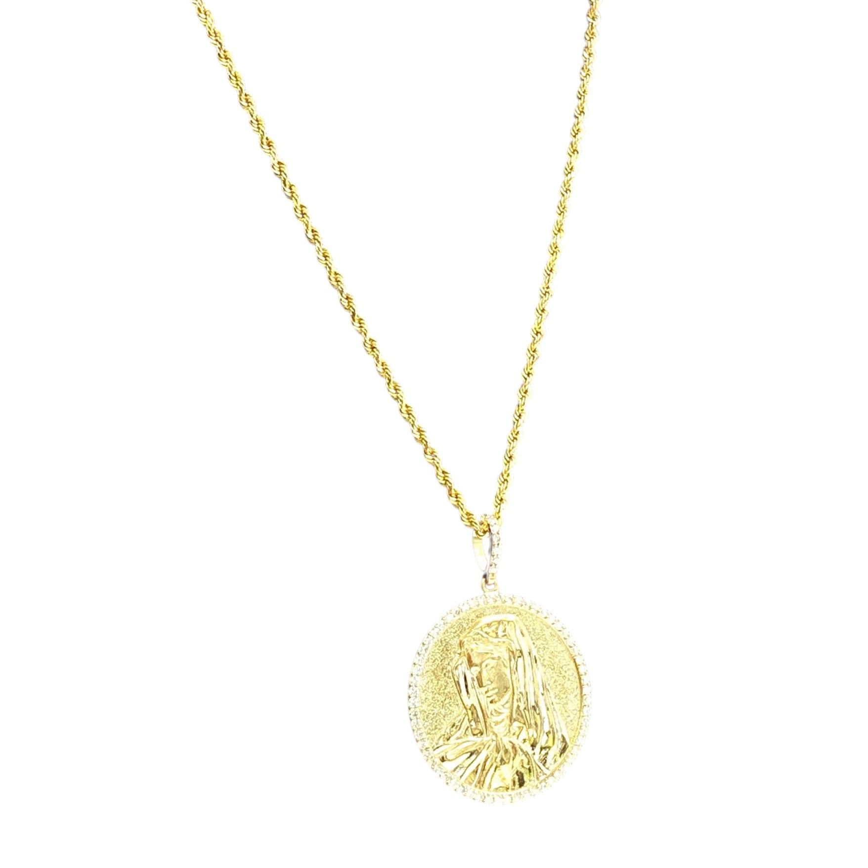 an 18in. rope chain adorned with a cubic zironia encrusted Mary Magdalene pendant and a lobster lock in solid 14K yellow-gold.