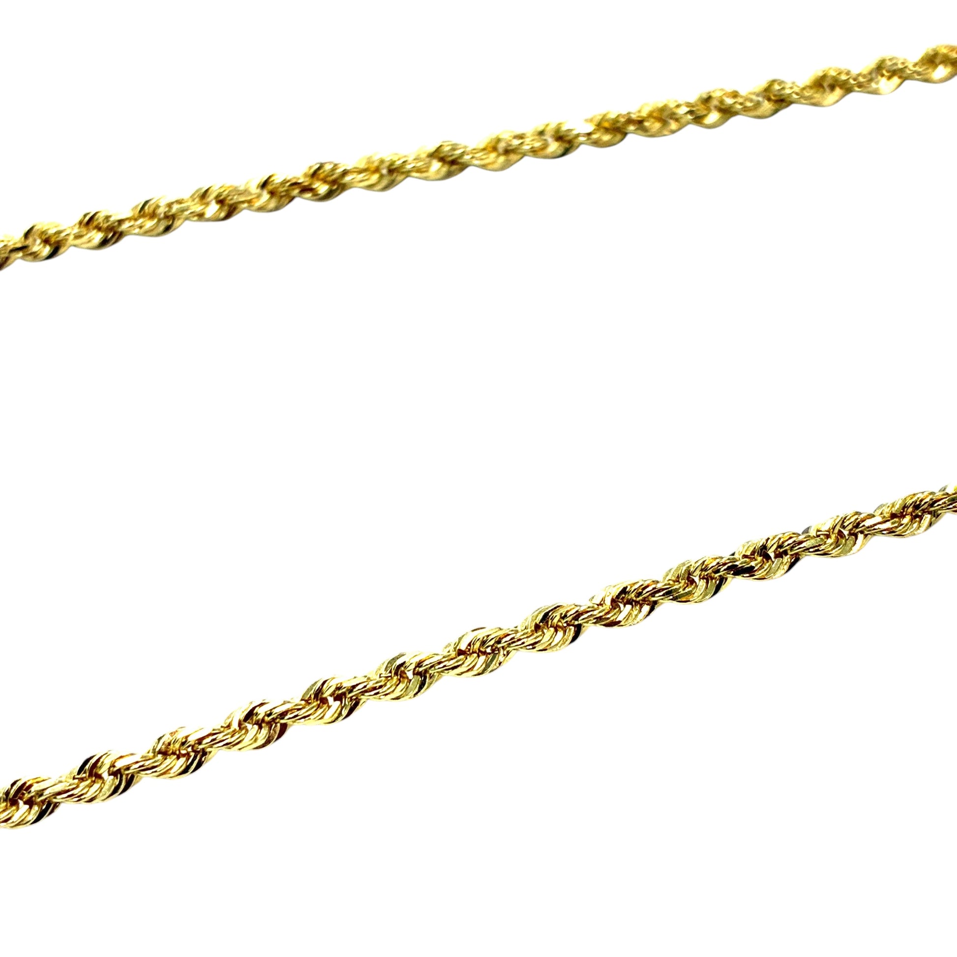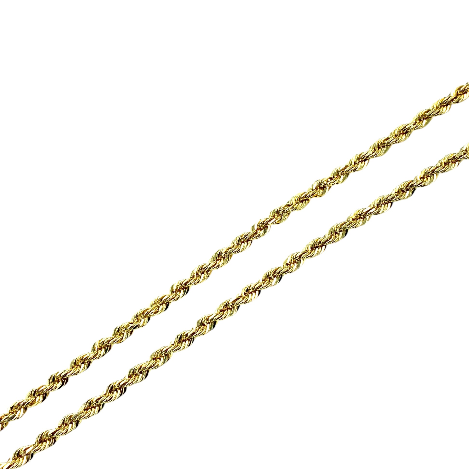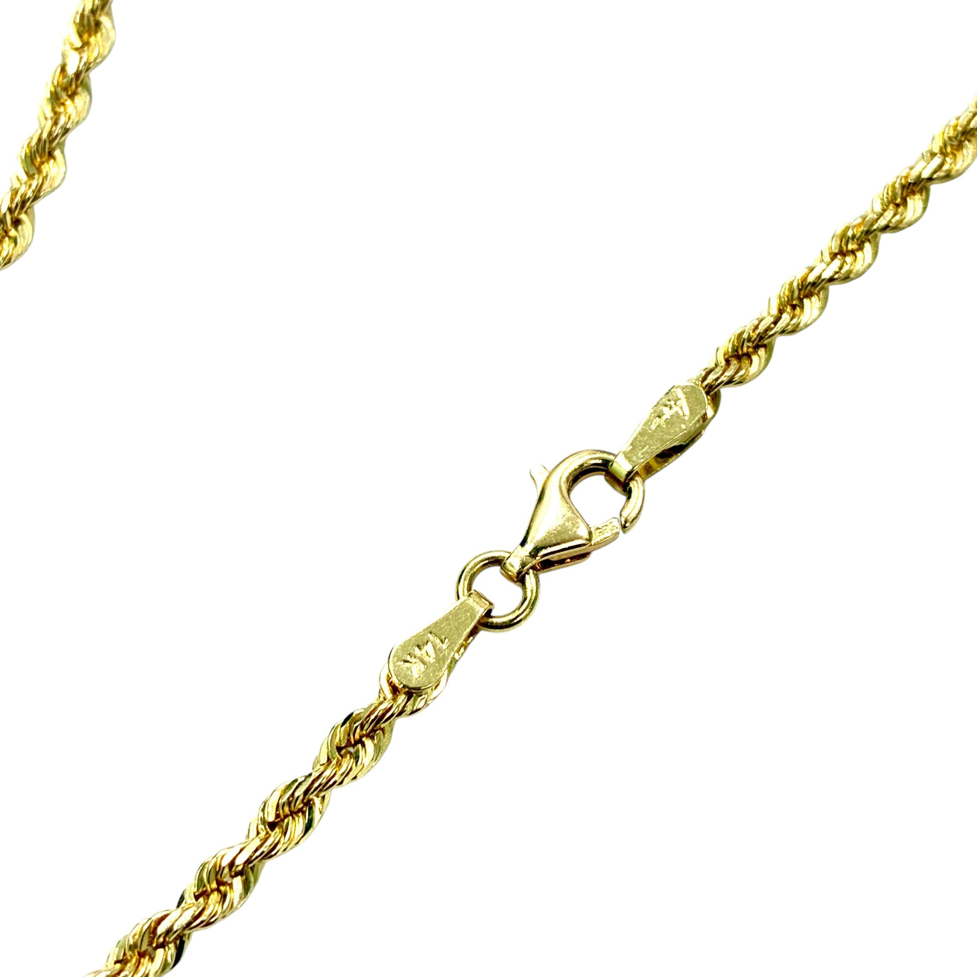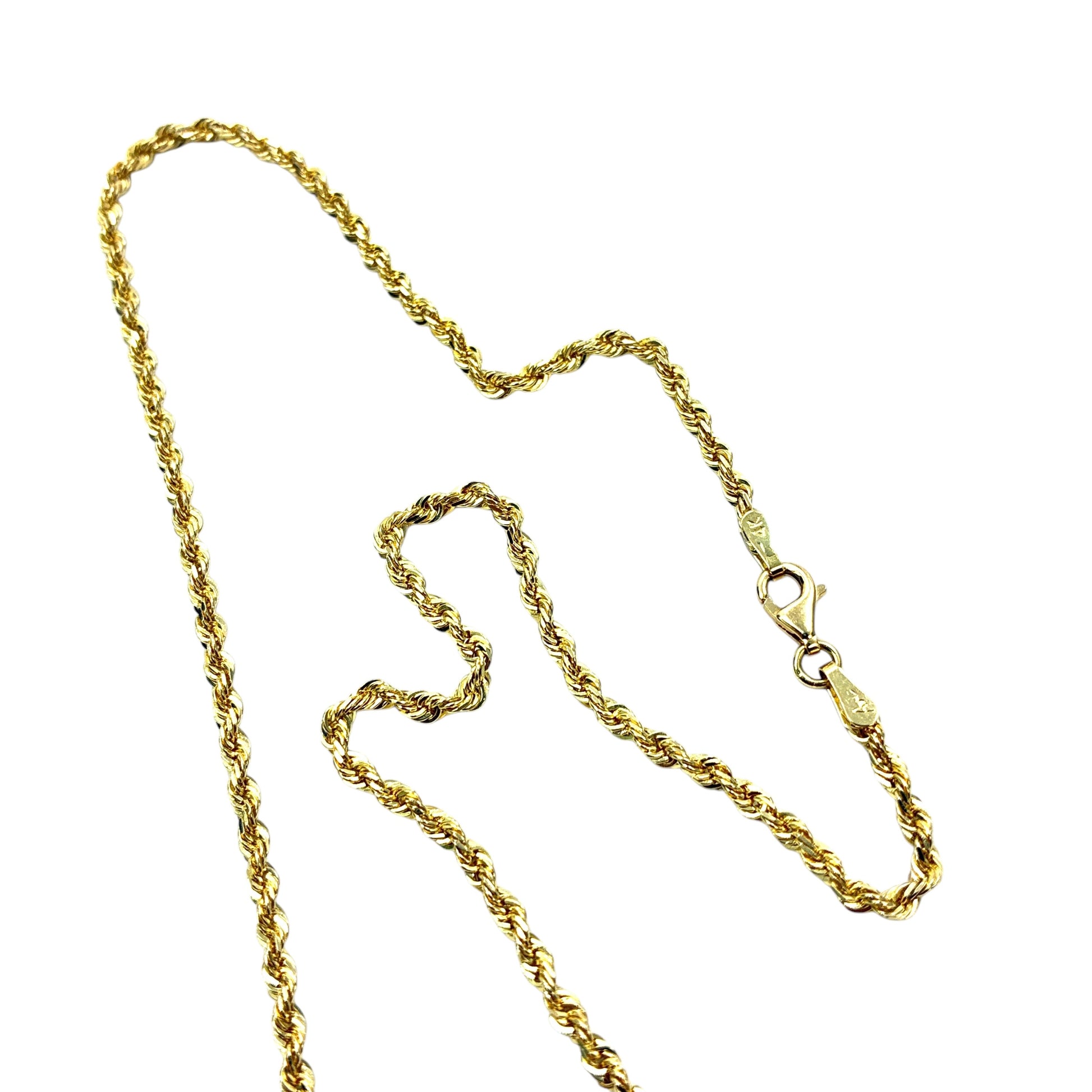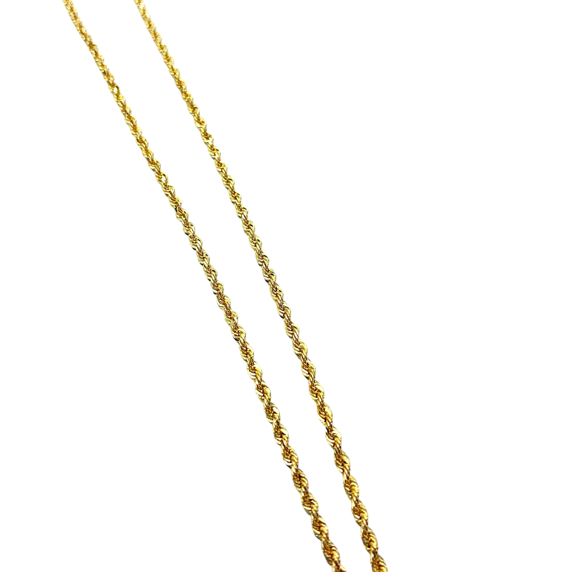 an 18in. rope chain adorned with a cubic zironia encrusted Mary Magdalene pendant and a lobster lock in solid 14K yellow-gold.