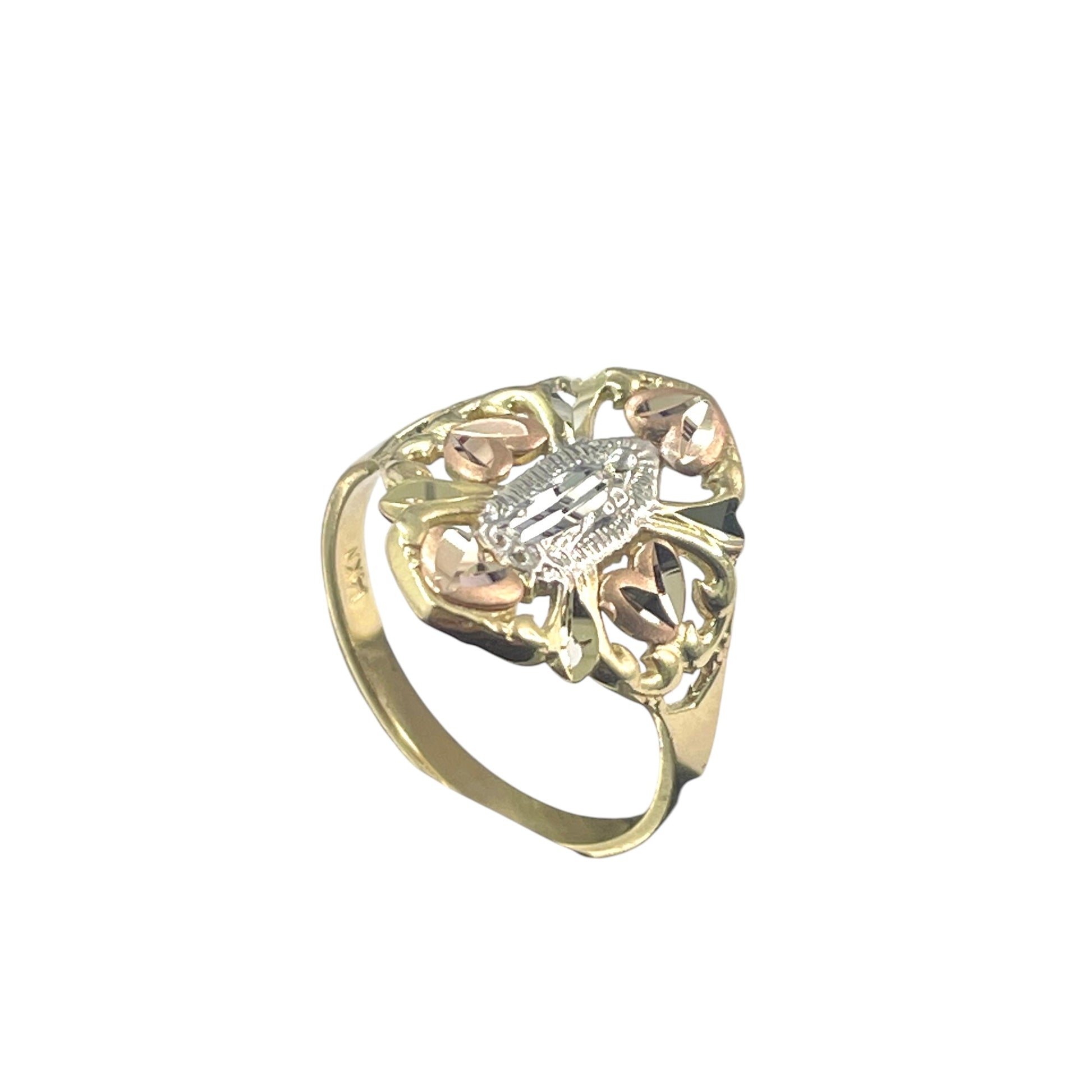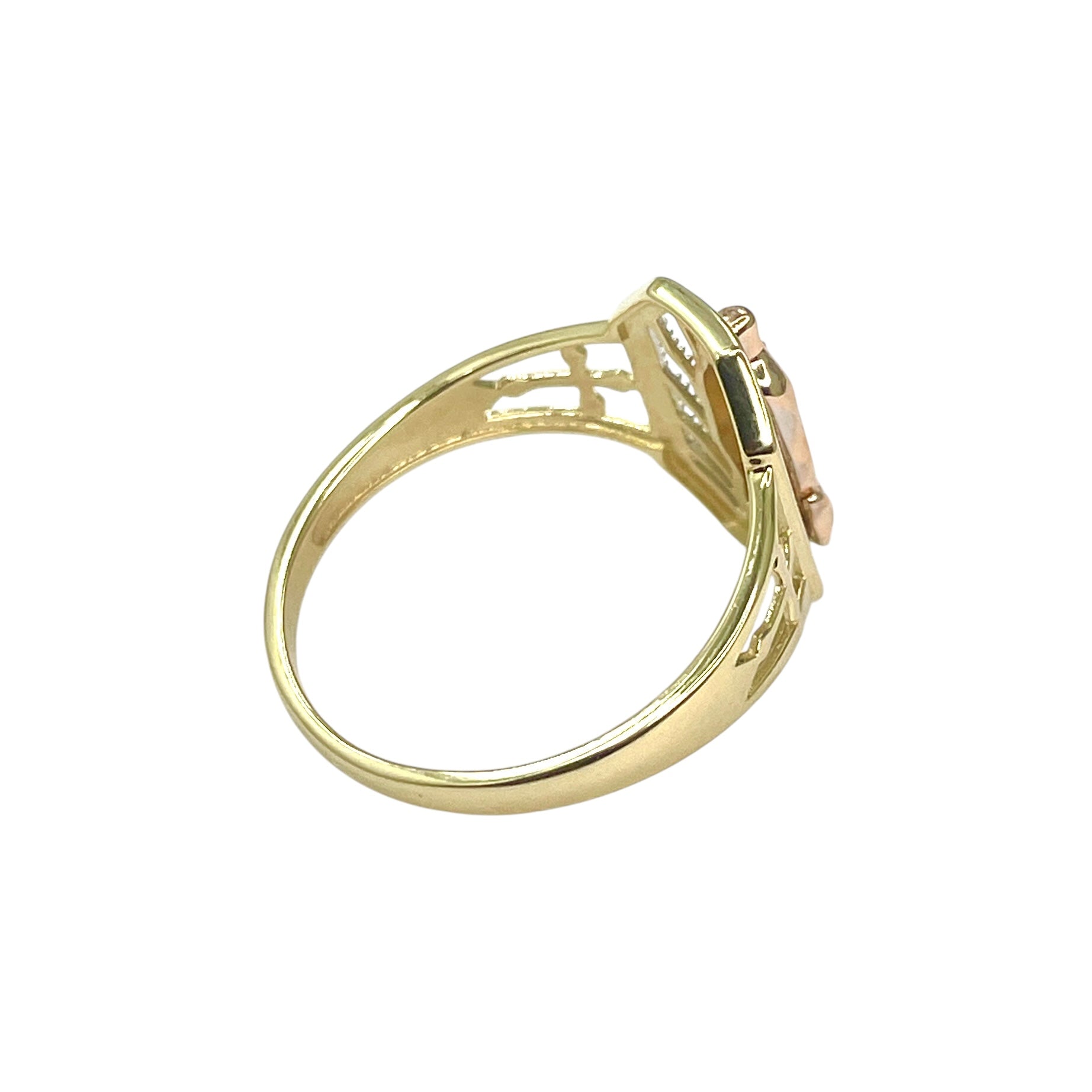 14k multicolored jesus ring in rose-gold, white gold, and yellow gold.