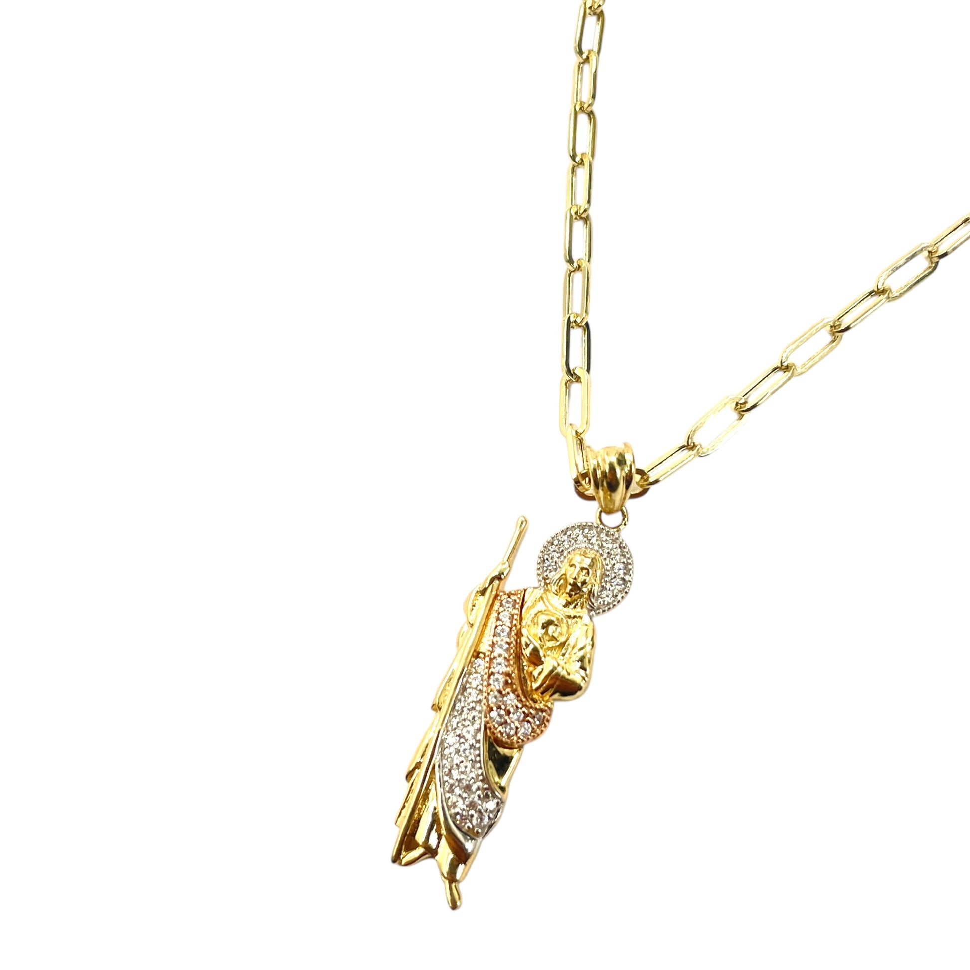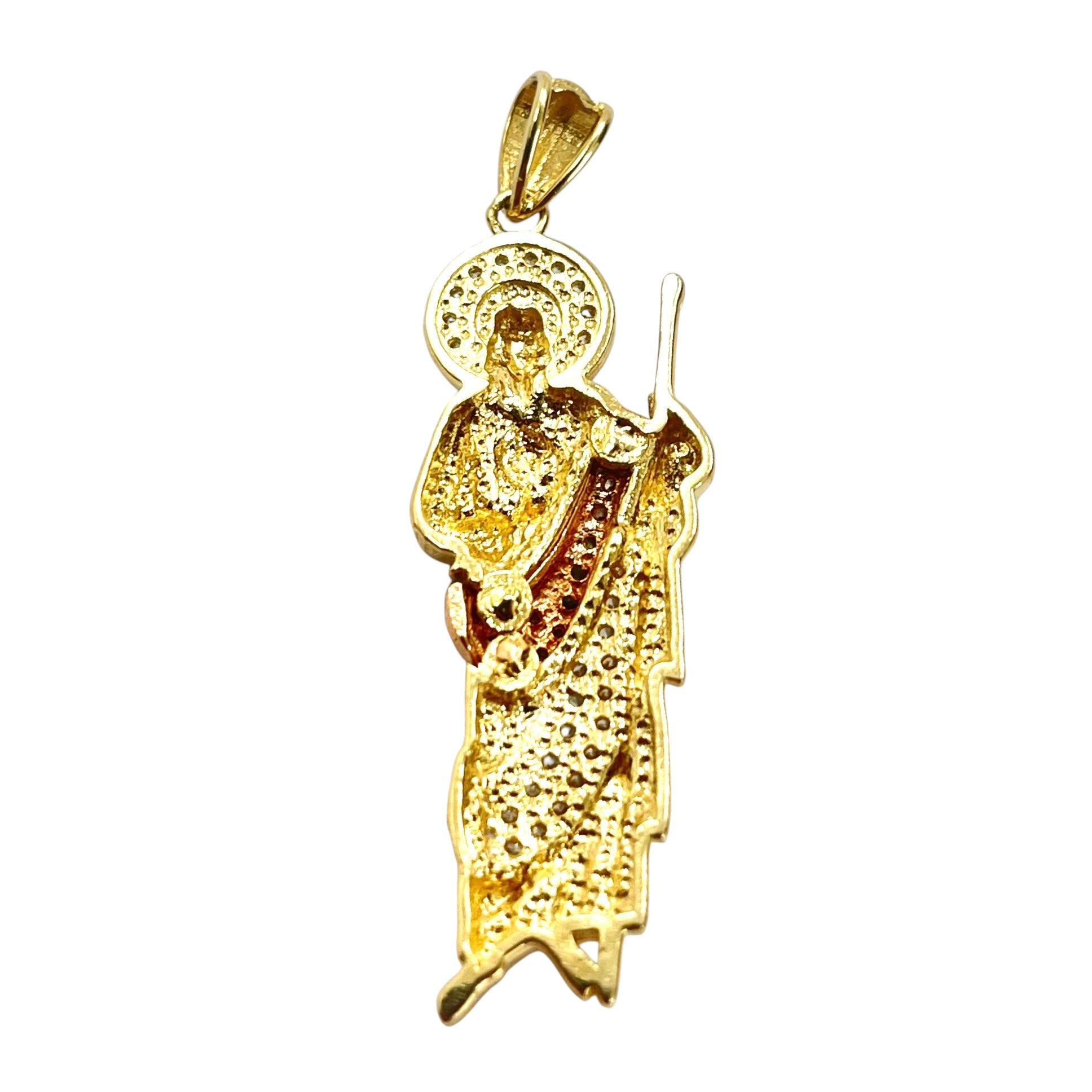 An extra small St Jude pendant in 14k solid multicolored gold and embellished in cubic zirconia.