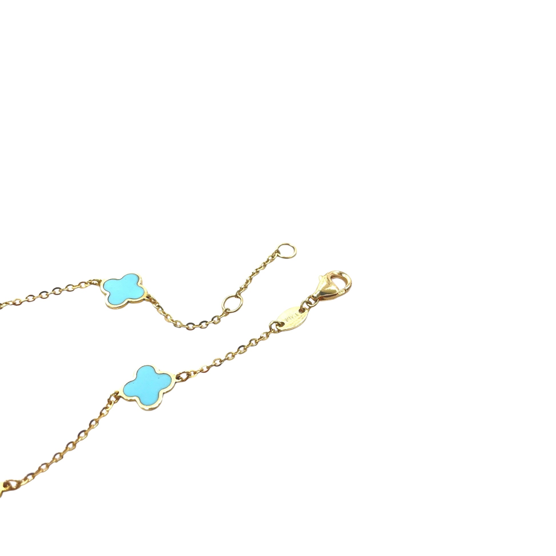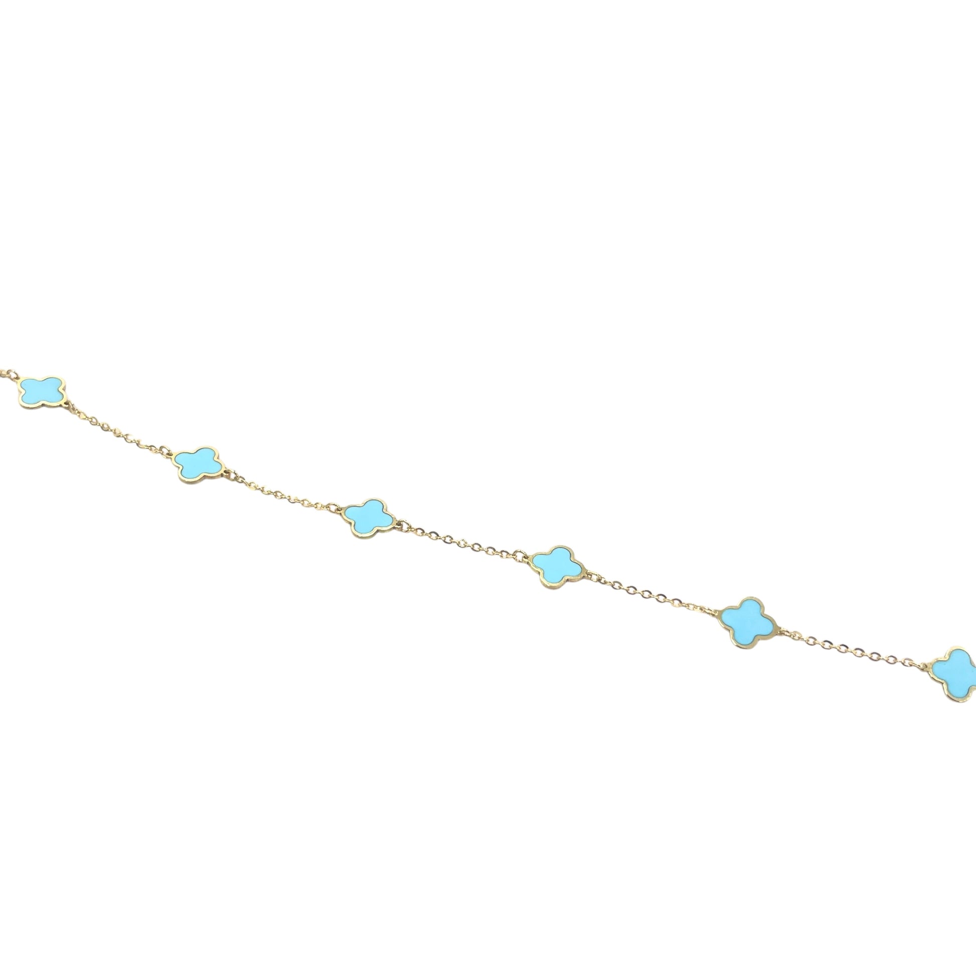 A turquoise blue clover link chain bracelet. Features 6 clover charms. All in 14k solid yellow gold.