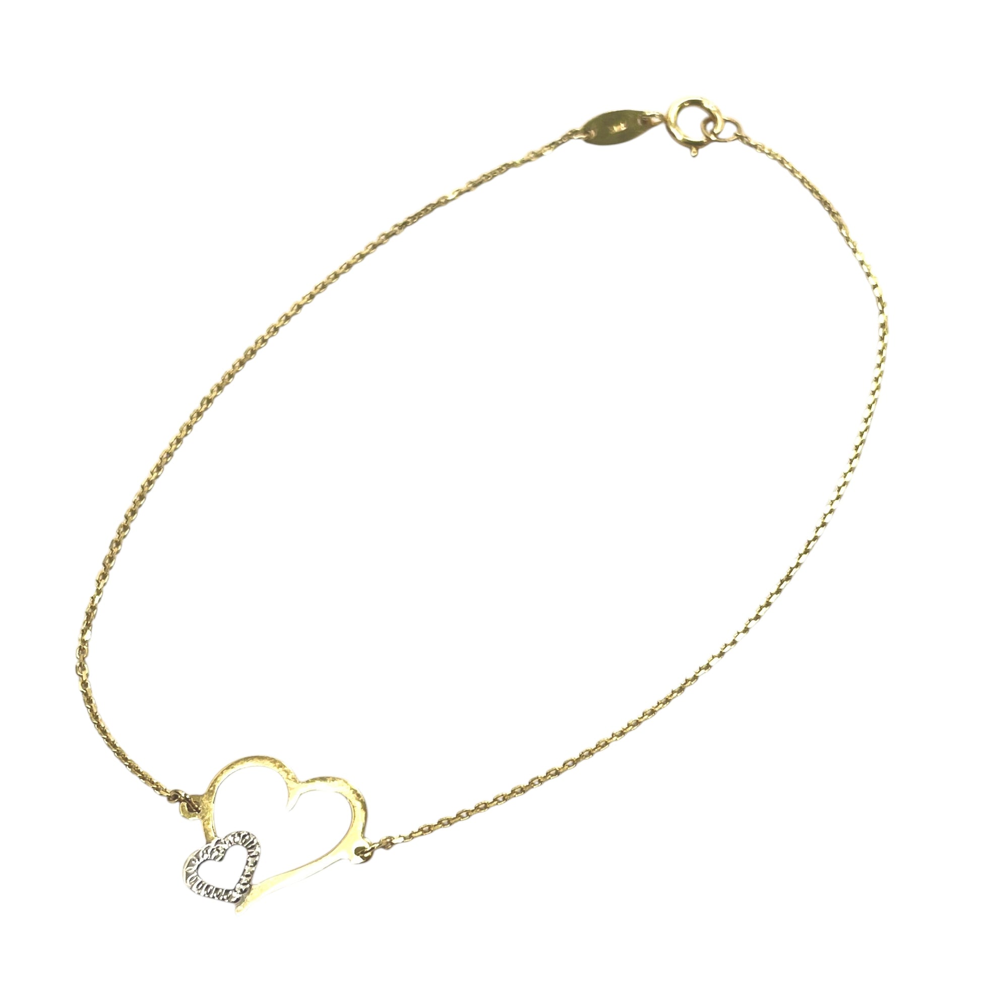 A connecting two-tone double heart link chain bracelet with a spring ring clasp. All in 14k solid yellow gold.