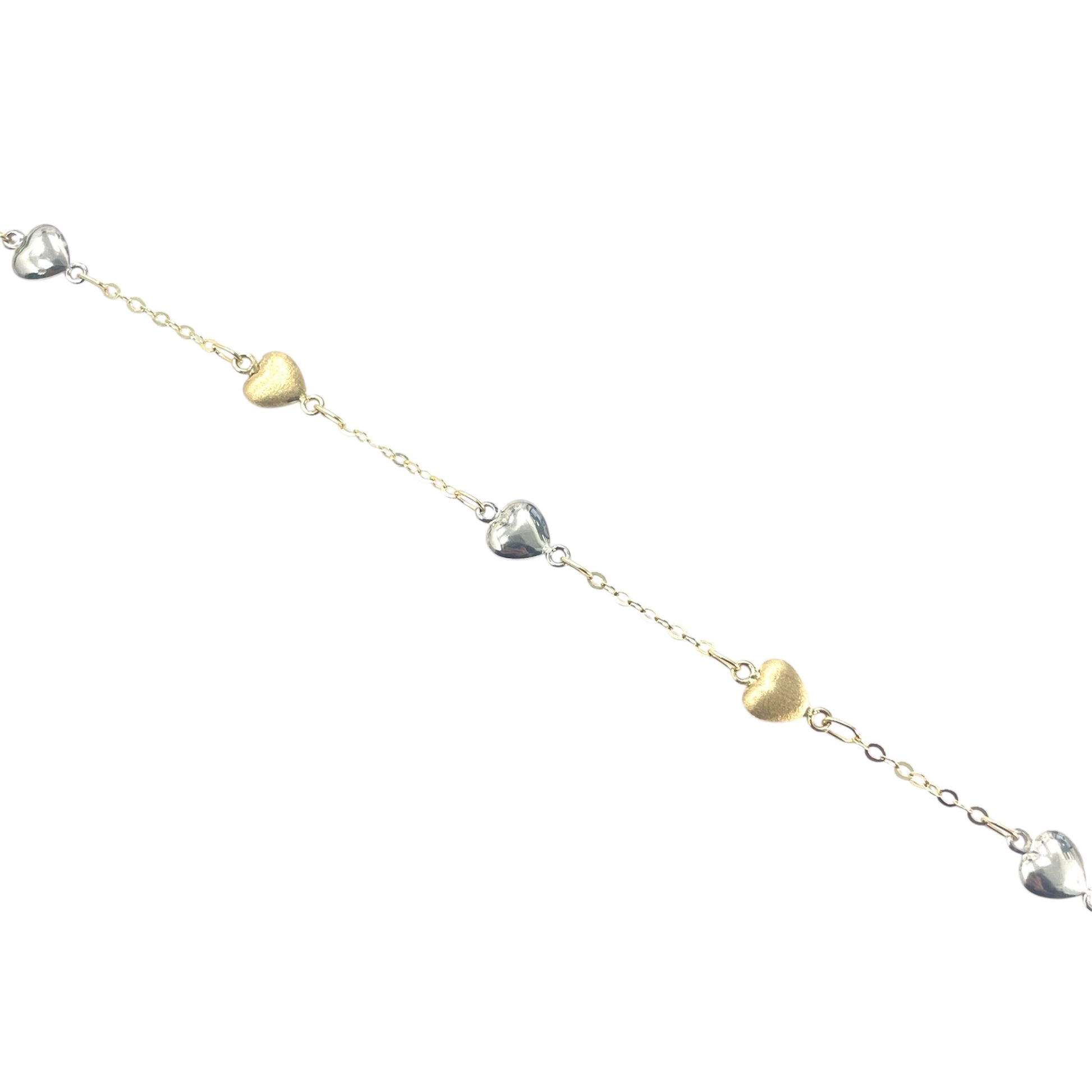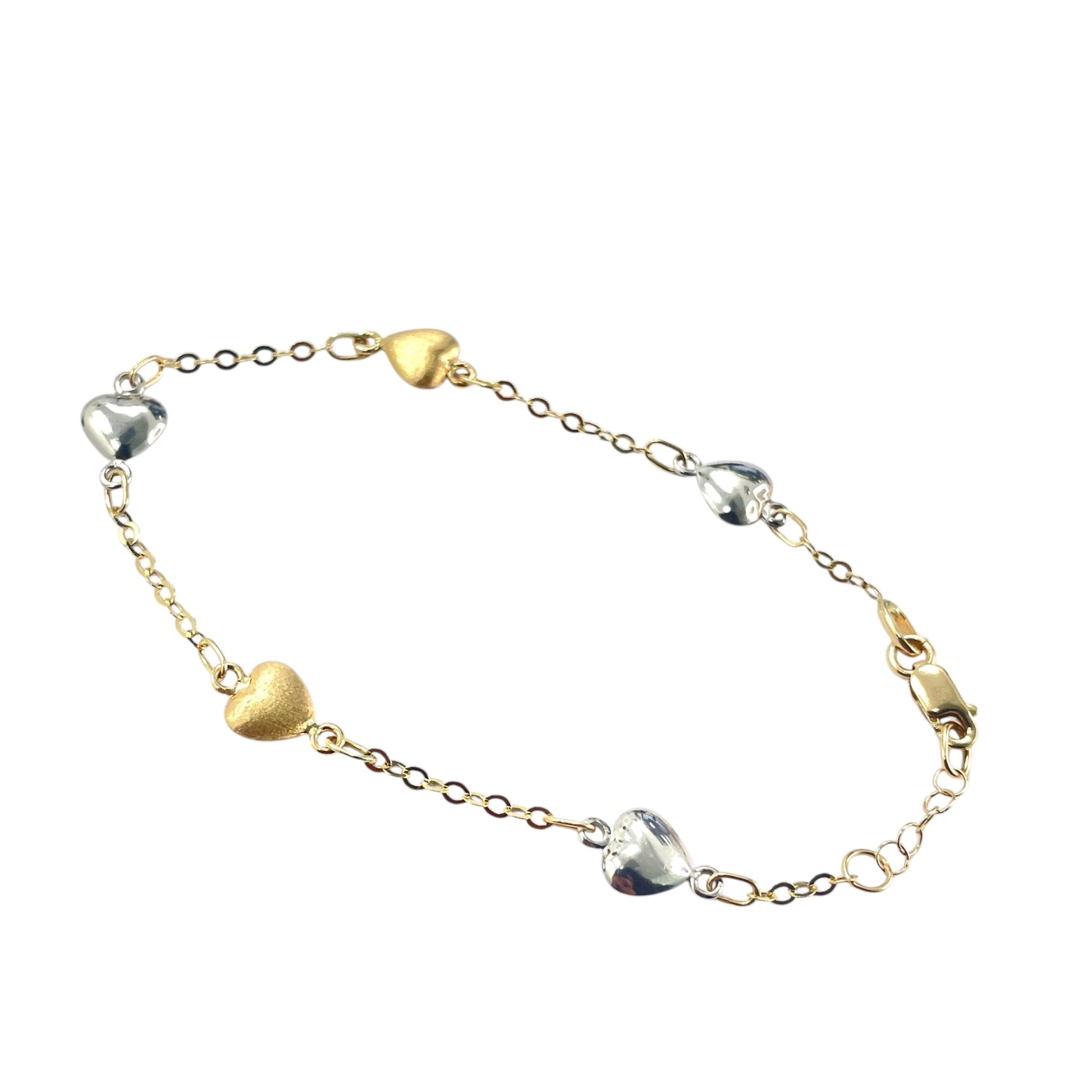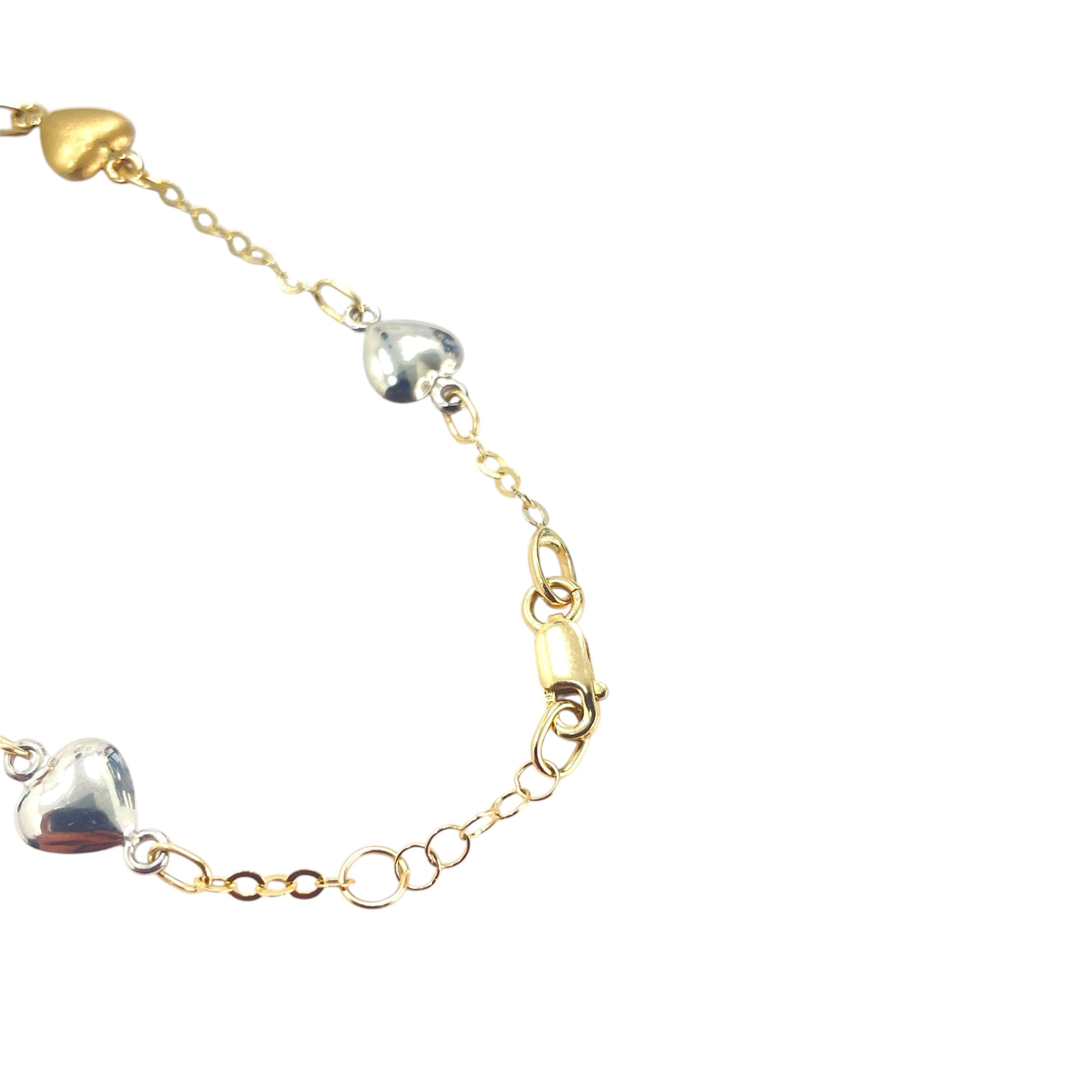 A two-toned textured heart fancy charm link bracelet in 14K solid white & yellow gold.
