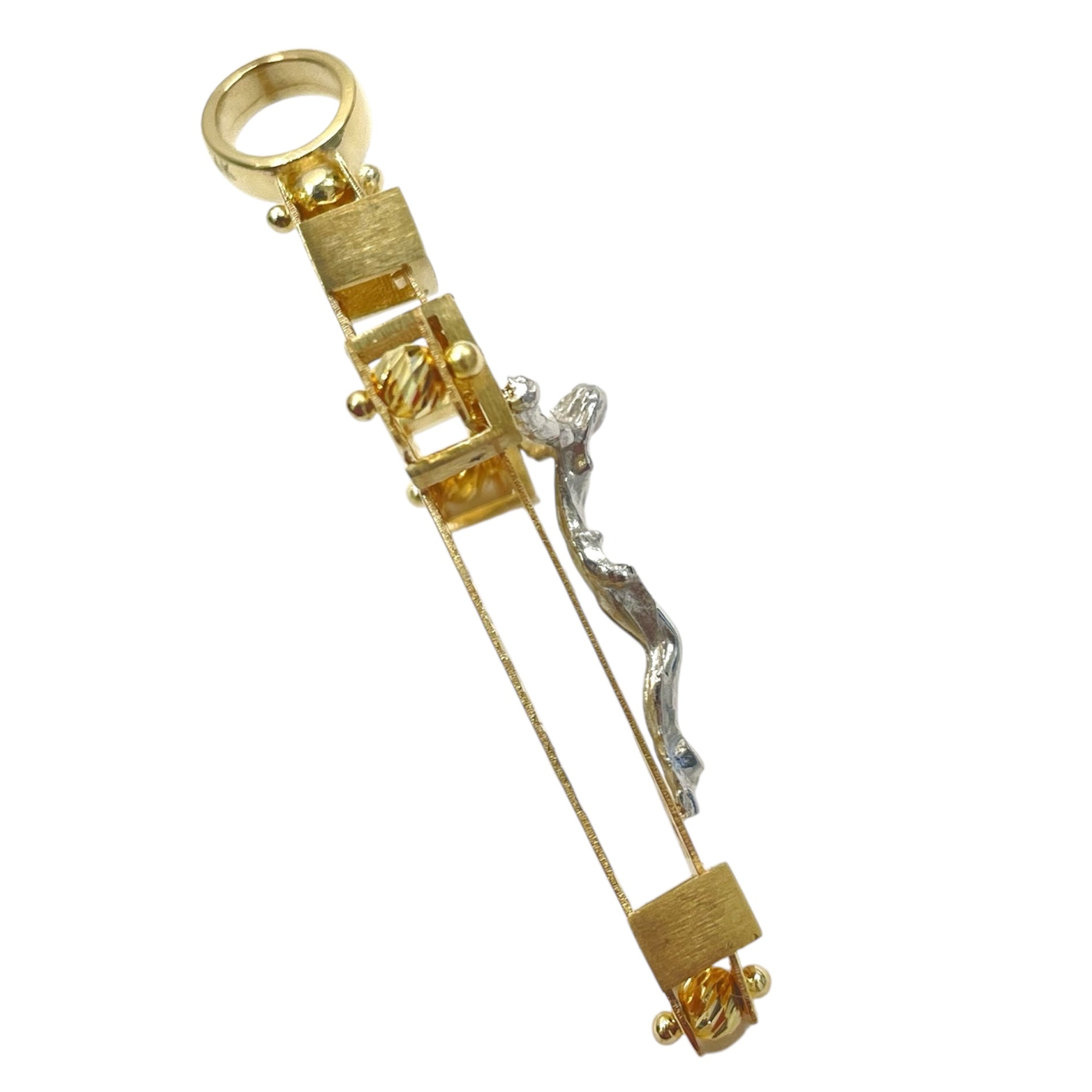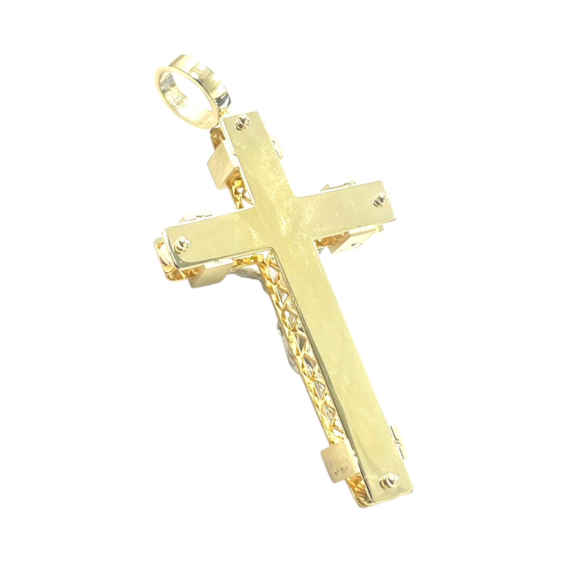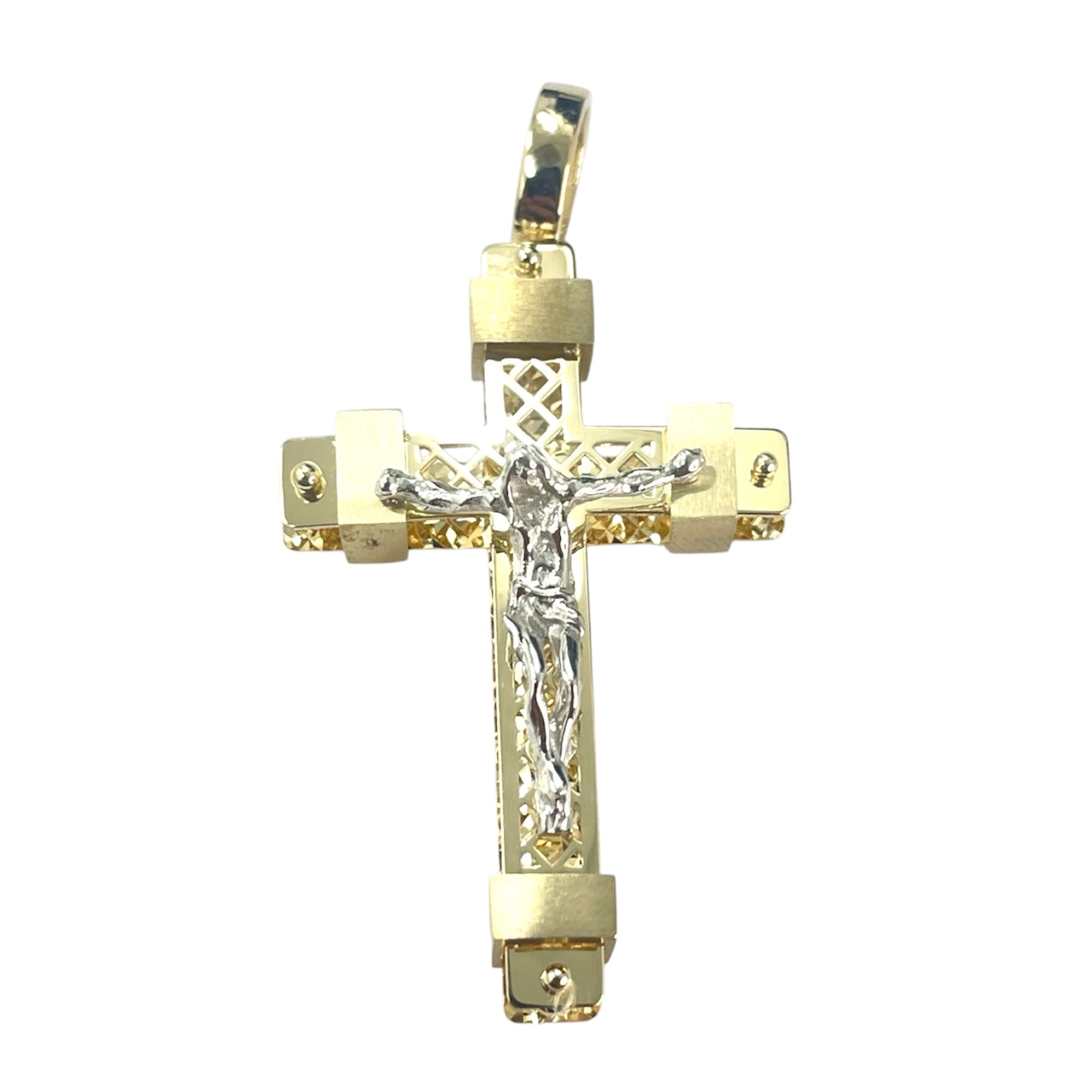 A 2x1in. 14k solid yellow and white gold crucifix pendant. Features a lattice pattern and a solid gold back. 8mm thick.
