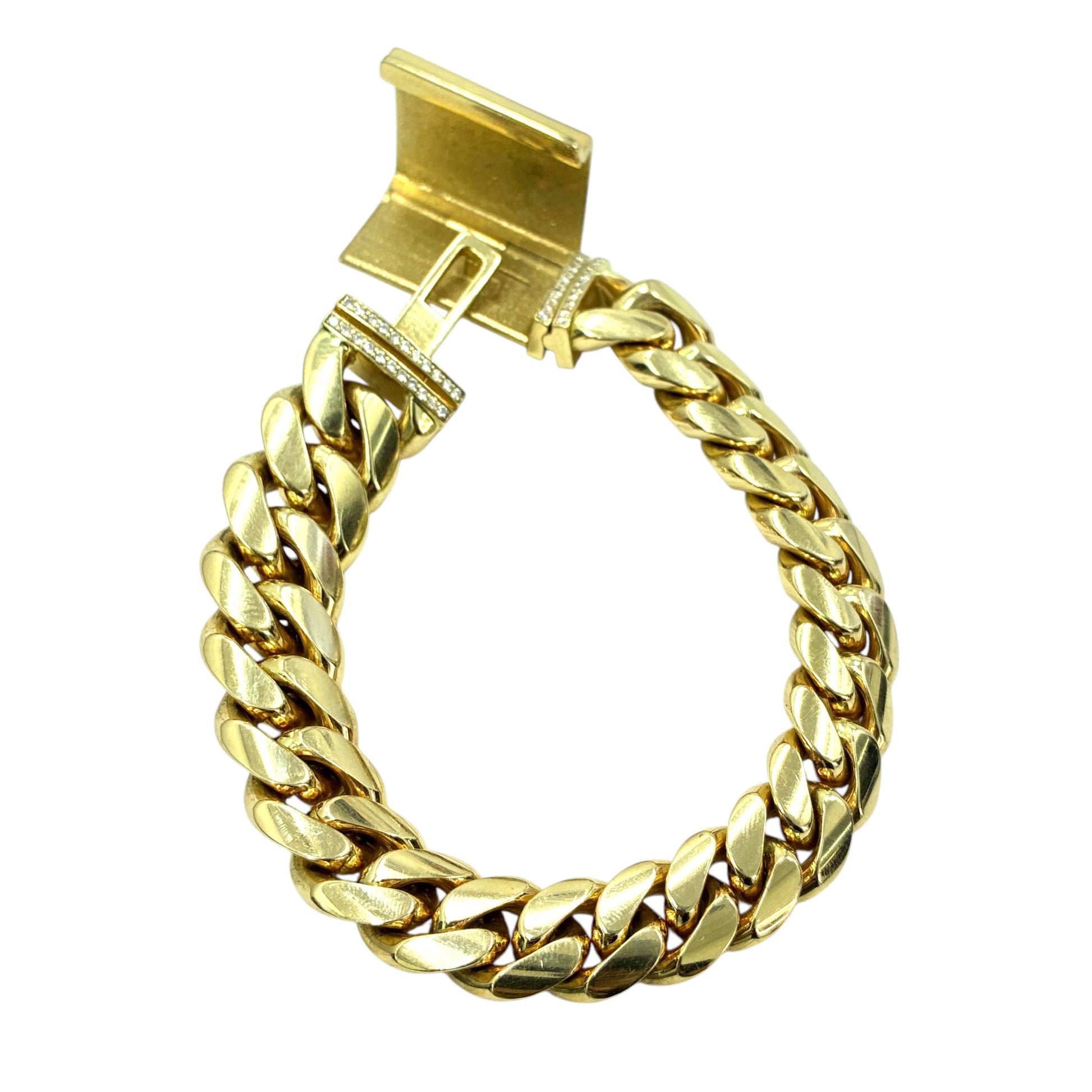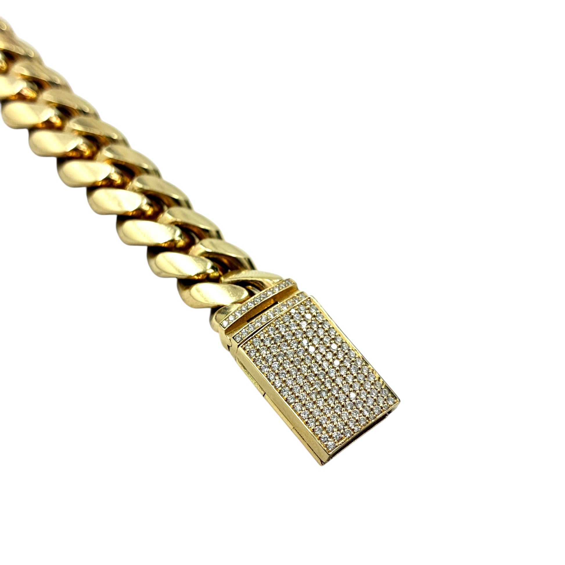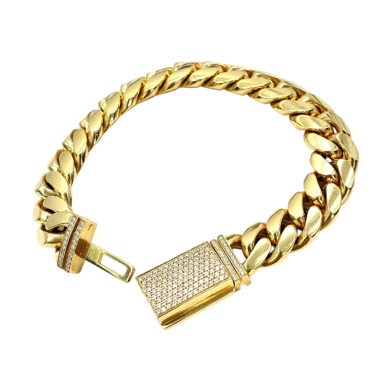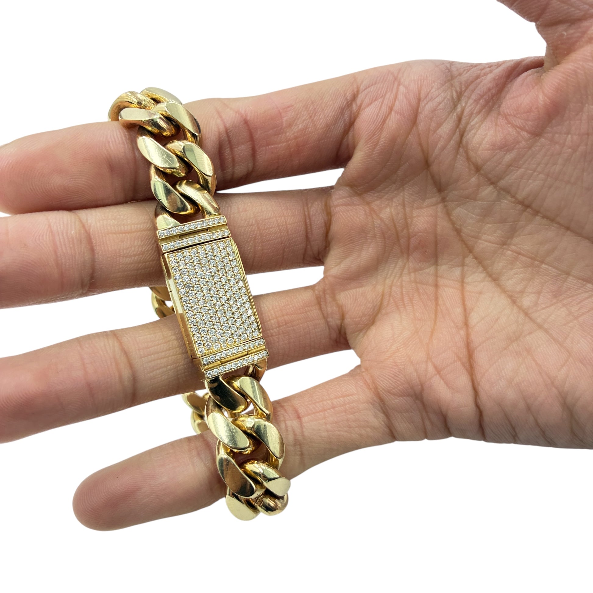 14k solid yellow gold chainlink bracelet with a 2.5ct lab diamond box clasp lock.