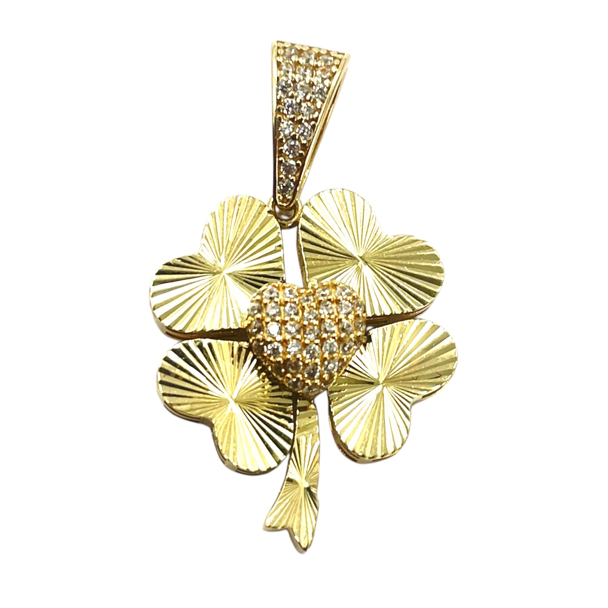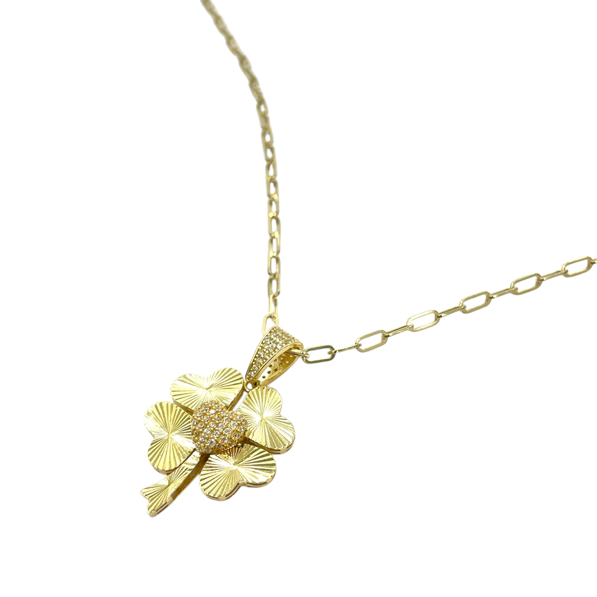 A four leaf clover shell pendant in 14k solid yellow gold.