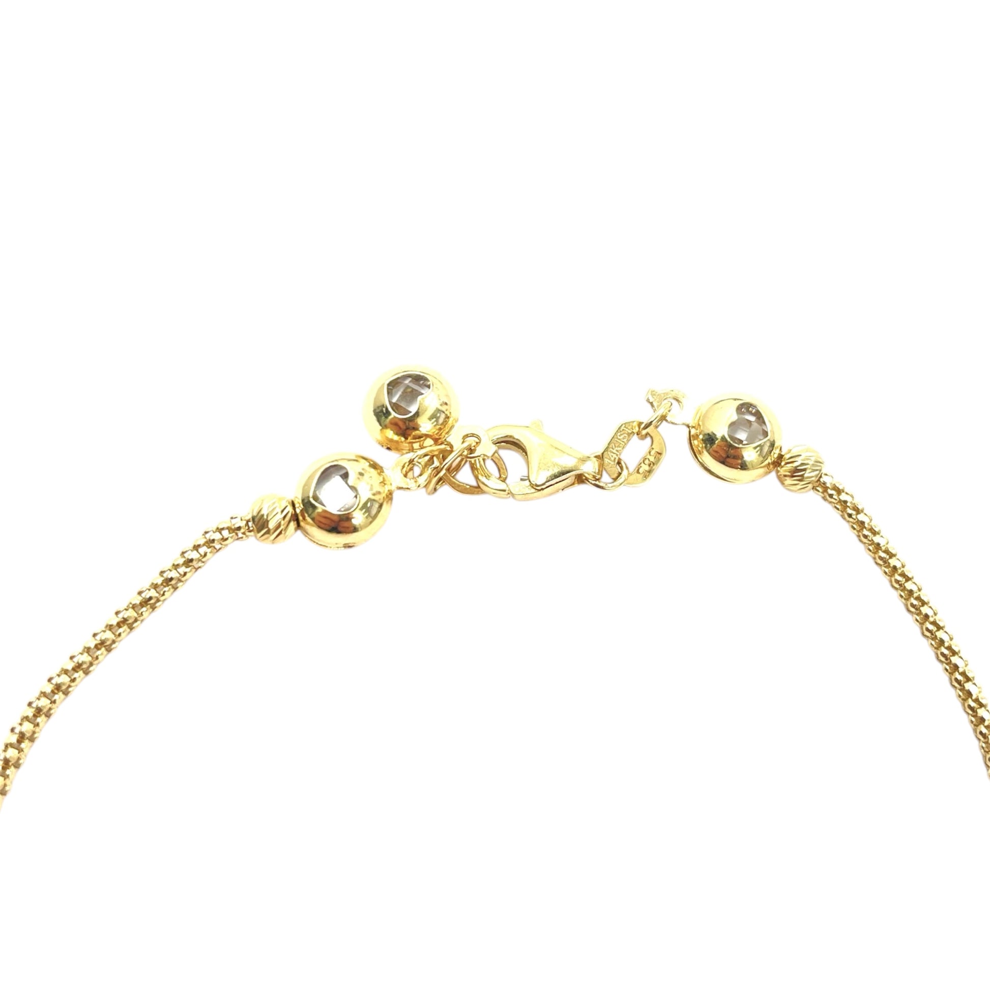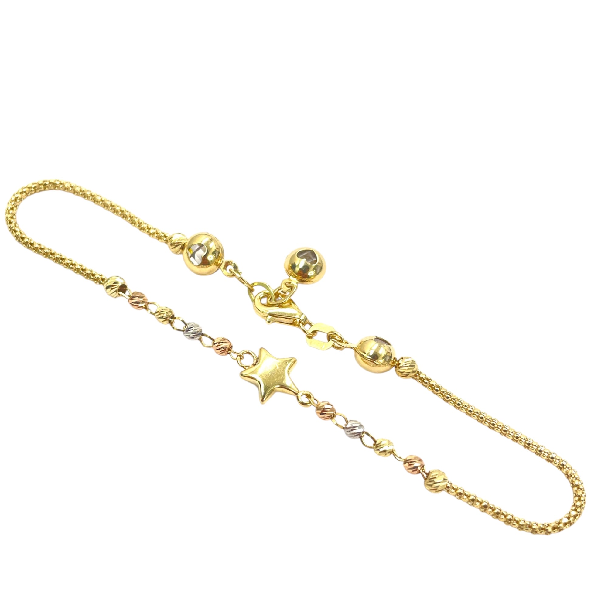 A popcorn chain bracelet with a tri-color beaded chain on the center with a star charm. All in 14k solid gold.